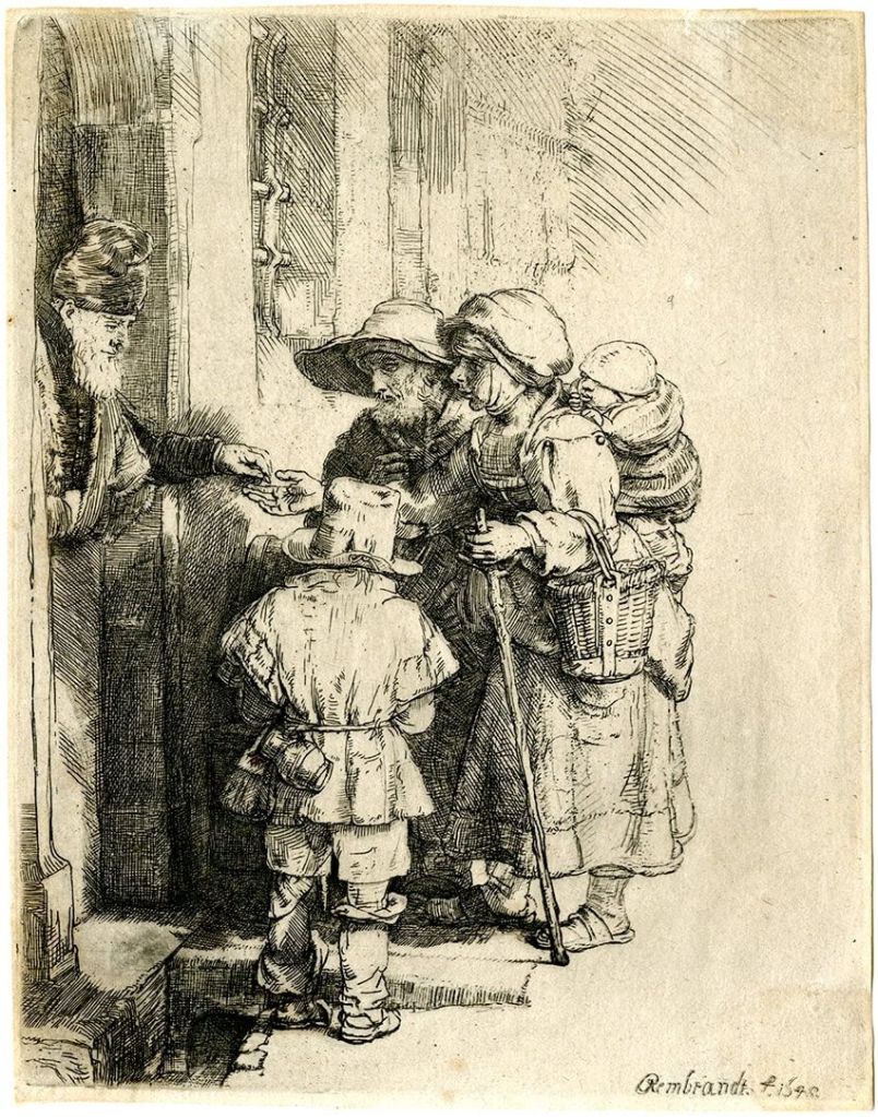 Beggars Receiving Alms at the Door of a House – engraving by Rembrandt