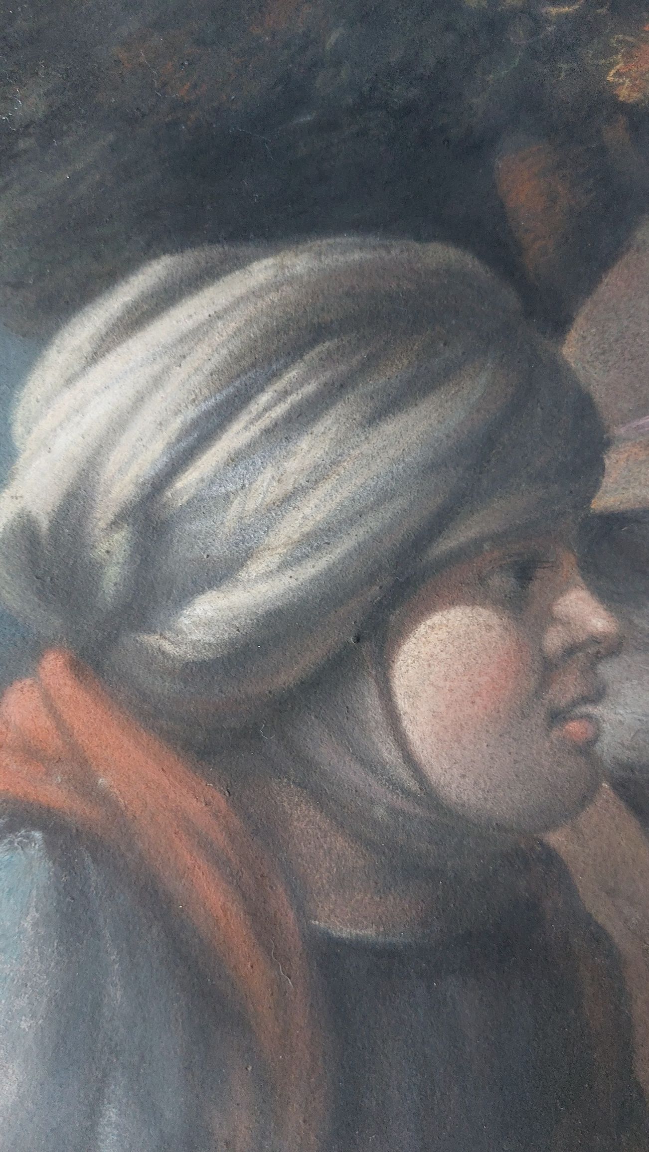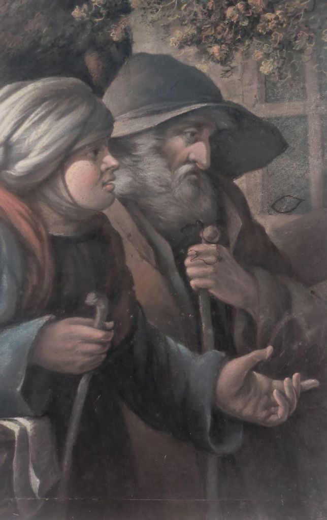 I recently added a pastel drawing to my collection. it was described as after Italian artist Antonio Rotta (1828-1903) and titled Charity to a Family of Beggars. This would mean that it is a 19th-century artwork. As with all pastel works, one must be careful while handling since pastel as well as chalk do not harden or soak into the paper. They are laid on top, which means they can be smudged or rubbed off.