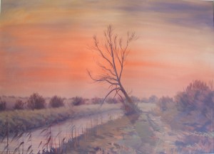 His inspiration is found in the land which surrounds him. Walking to most of the scenes which he paints. Local does really mean local. His love and respect for his subject, the fenland, is honestly portrayed in his paintings. Bringing to life the warmth, the expanse, the depth and at times wildness of the fens. Monk’s Lode runs between Cambridge and Ely. Walk or cycle this path and you too can experience the sights, sounds and odours which inspire Mr Day’s paintings. Feel the fens first hand; their lushness, their starkness, the life they enfold, the vast landscapes, expansive skies, and vivid colours of life and decay. This is a part of the country which many consider ‘too flat’ to be lovely but just one look at Mr Day’s paintings proves that the Fens, even though flat, have a beauty, a depth, an honesty which can be felt. They seem to say “I am what I am. Accept me for what I am. Love and respect me for what I am. I am no more no less”. ‘Sunset at Monk’s Lode’ hangs prominently in my living room and is a continuing reminder that this is the beauty in which I live.