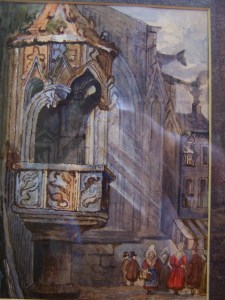 This lovely pulpit is, I believe, the external pulpit of Notre-dame Cathedral, St. Lo. Few cathedrals have an external pulpit. The painting dated 1852 certainly shows a time of prosperity and peace. The pulpit was saved from demolition by Victor Hugo in 1863.