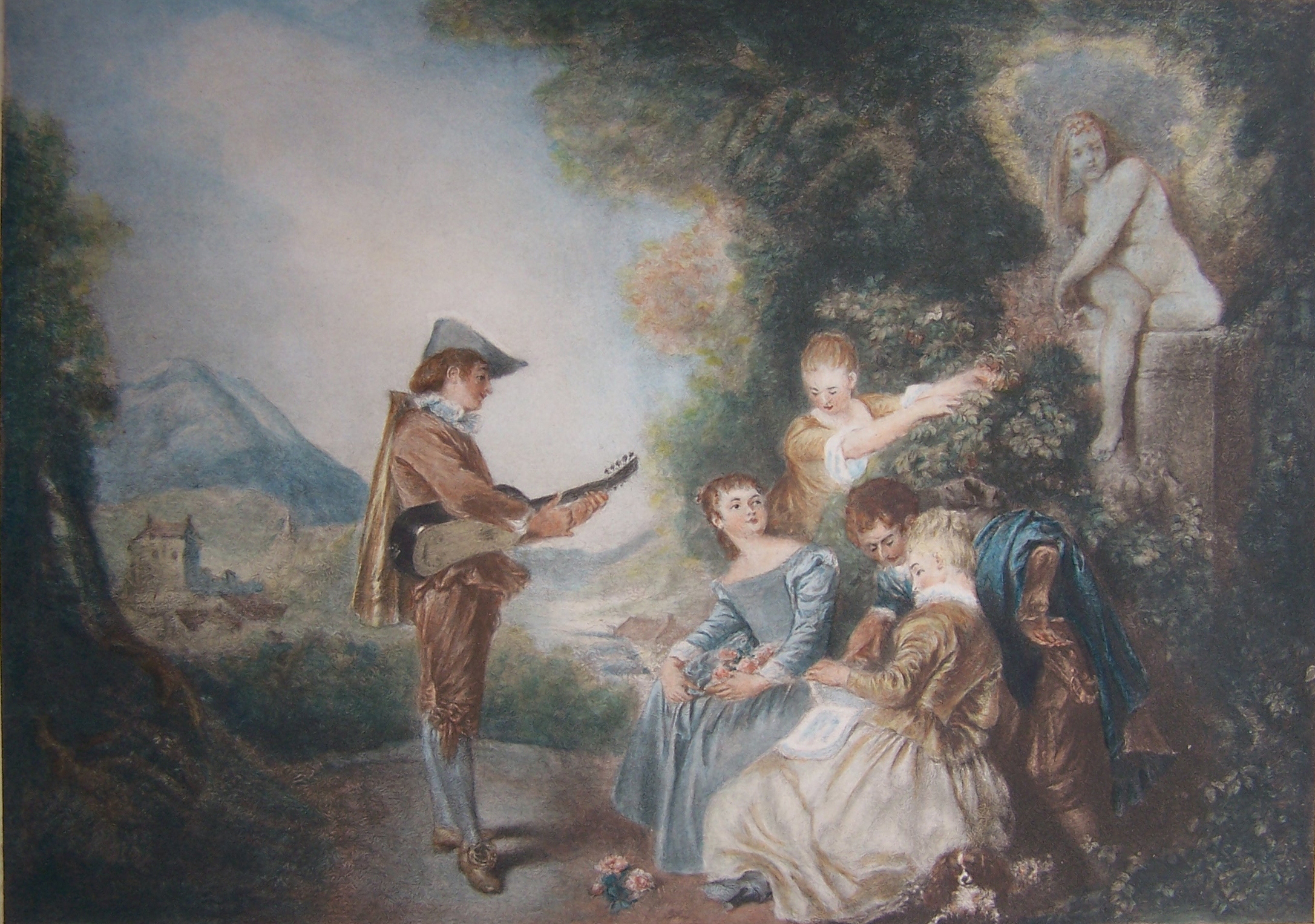 I purchased the previous chapters lithograph and the one on the left at the same time. The quality of the work is what struck me first. For lithographs which are near or over 100 years old the colours are absolutely wonderful. This lithograph was produced by Franz Hanfstaengl, Munich from an oil painting by Jean-Antoine Watteau (1684-1721). These two lithographs have travelled many miles with the Lionel Ewart (previous chapter – Emma Hamilton) having been set in its frame by Braus Galleries of New York and this Watteau lithograph by the Beverly Picture Framing Studio in Beverly Hills, California.