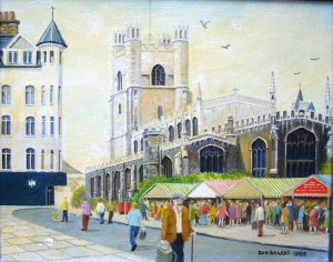 The first is an oil painting by local artist Don Beards. It is a quaint image and shows the colour and life of the Cambridge Market. Great St. Mary’s stands in the background imposing herself upon the scene. She is the ‘Cambridge University Church’. A focal point for many a year in down town Cambridge. The market place has existed from Saxon times and a daily outdoor market with stalls continues to operate there today. From the market square, one can step quickly onto King’s Parade, Trinity Street, Sydney Street, and St Andrews Street. A central hub from which life flows to and fro. The heart of a great city filled with vibrancy, colour, youth and learning.