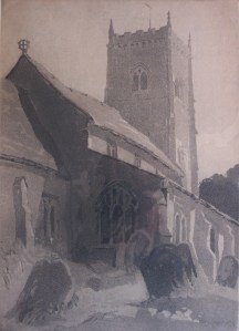 It is this exposure to varying amounts of acid which creates the different tones in the image. One can also etch onto the plate (before the acid exposure) an outline of the image or any aspects of the image which one might like to add definition to. Here is an aquatint of Barwick in Elmet Church in Yorkshire. The difference in tonality is plain to see but it does not appear that Beatrix Holm etched an outline or any other defining lines onto the plate. The church is seen from the north on which lies the cemetery. The tower of the church was used as a lookout for any enemy parachute incursions during WWII. One can visit the church today. I’m not sure how old this aquatint is but my guess would be that it was made around 1930.