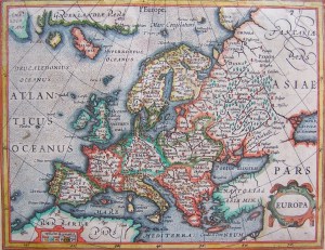This lovely little map of Europe was done by Jodocus Hondius for the first French-text edition of his ‘Atlas Minor’. Shortly after the publication of the large folio-atlases a need arose for a smaller sized atlas, one that would be handier and above all, cheaper. The ‘Atlas Minor’ was larger in format than other small atlases available at the time allowing for far greater detail and more place names than found in its rivals. I know this map comes from the French-text edition in that on the reverse it has text printed on it. He is best known for his early maps of the New World and Europe, for re-establishing the reputation of the work of Gerard Mercator, and for his portraits of Francis Drake. He helped establish Amsterdam as the centre of cartography in Europe in the 17th century.