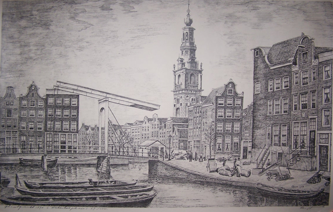I have had in my possession for many years a print, so many years that I do not remember how or where I acquired this print. I know that the print shows the meeting of the Leprozengracht canal and the Houtgracht canal. Waterlooplein was created in 1882 when the Leprozengracht and Houtgracht canals were filled in. The square is named after the Battle of Waterloo in 1815. This print is titled (Houtgracht, 1870, Waterlooplein)and numbered (27/100) and signed (Cornelis Spook 1958). Now-a-days with the internet, one can find information on art prints and other various things. I found an image (wonderfully hand coloured) of the print I have (uncoloured) and thus have finally gained access to some information in regards to the artist. Well maybe. It is held in the City of Amsterdam Archives.