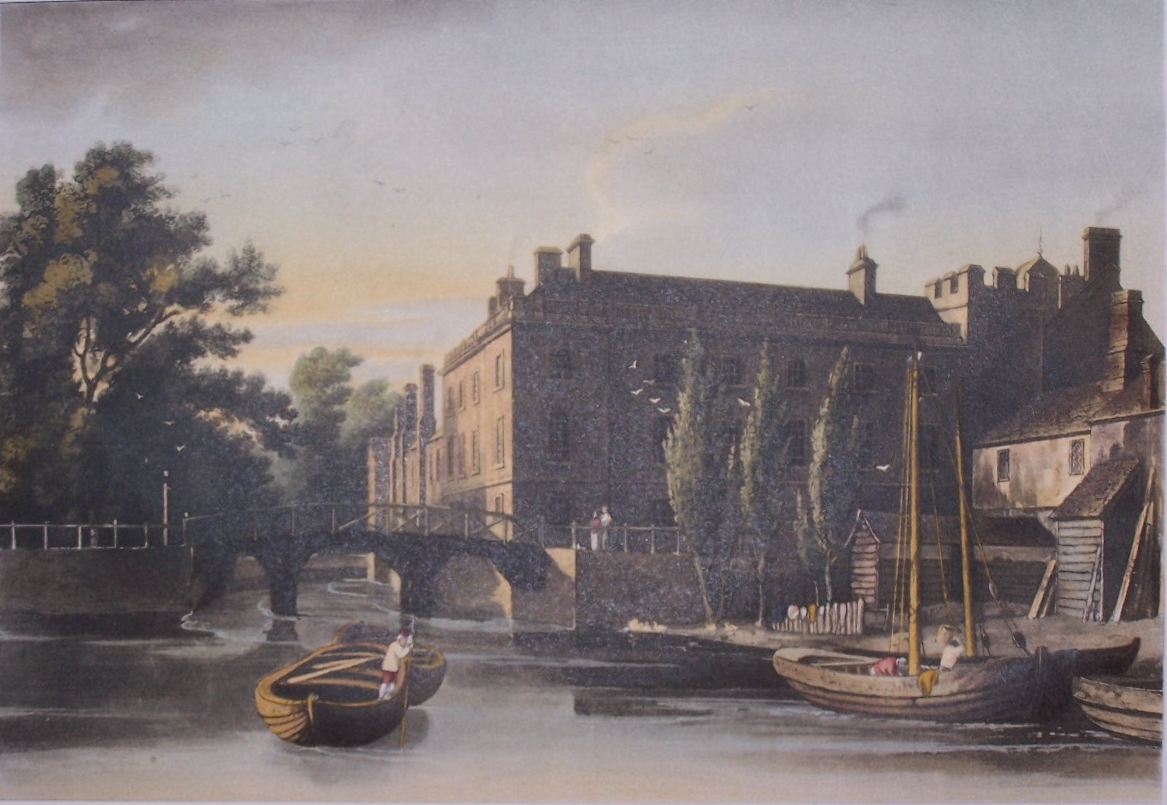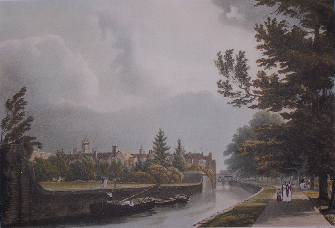We have two views of Queens’ College, Cambridge. These two images were originally produced for R. Ackermann’s ‘History of Cambridge’ in 1815. In my search for information regarding these two prints, I have yet to find and image of this first print. The river is the River Cam and the bridge seen in this first view is the Silver Street Bridge. The river which is used for punting nowadays was used for commercial trade as well as ferrying.