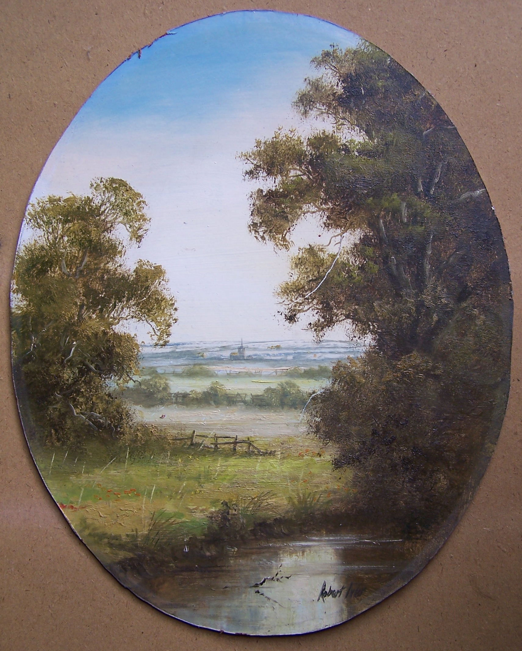 #RobertIver presents to us a tranquil setting. A river or pond in the foreground and fields enclosed by hedge rows drawing us towards the small chapel in the distance. Is this scene real or imaginary. Whichever, it matters not for as we look at this painting each one will be drawn to their own solace and respite. We might just wish to dip our toes in the cool water, or picnic in the field, or cross to the chapel – each will find ones own place .