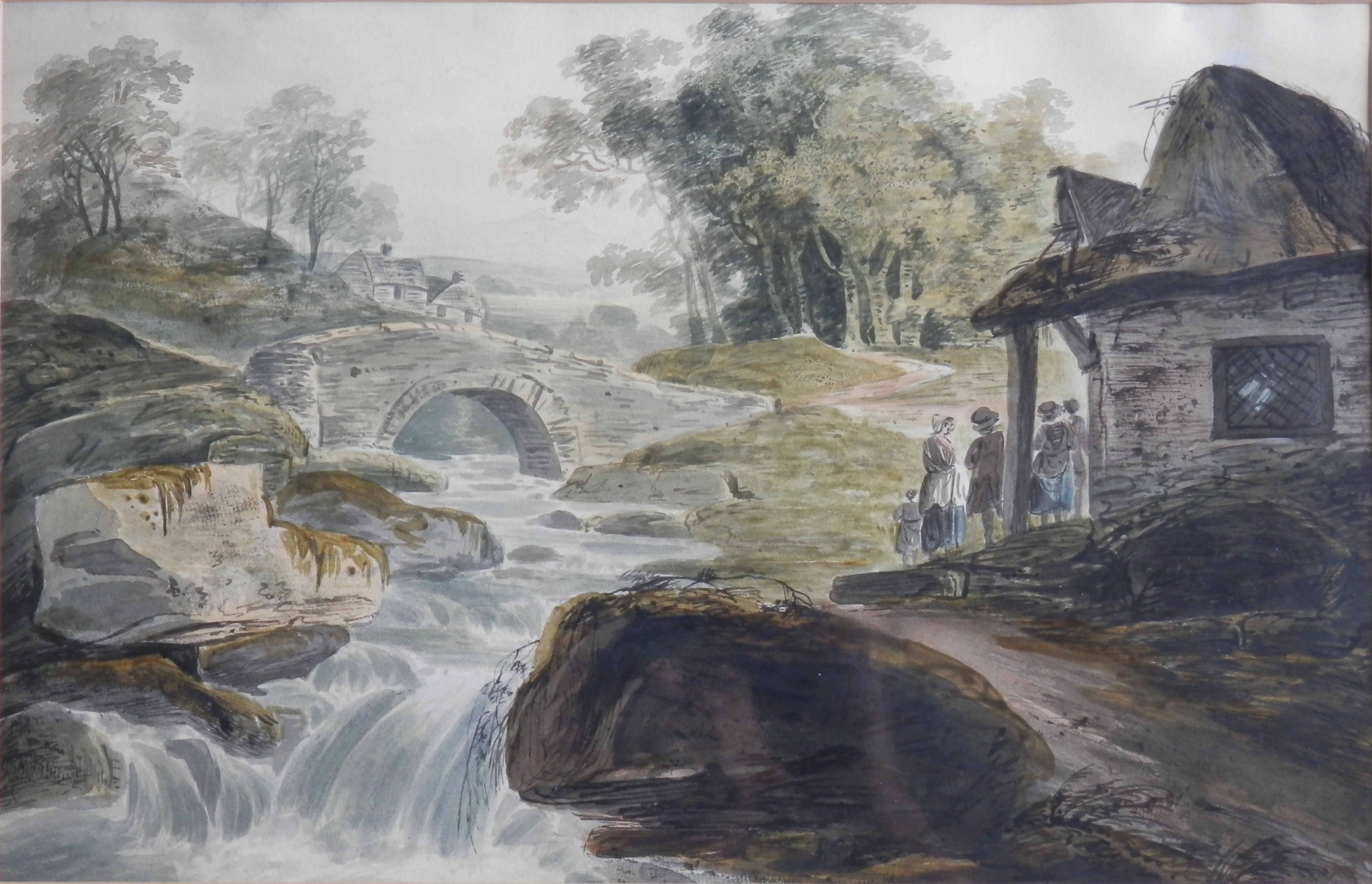 We begin with Paul Sandby (1731-1809), who was an English map-maker turned landscape painter in watercolours. His task as a map-maker was to survey the remote Scottish highlands. While performing his cartography duties, Sandby began producing watercolours documenting the changes in Scotland as well as Scottish historical events. Pictured on the left is, I believe, a cotton mill either found in Wales or Scotland. Thomas Gainsborough described Sandby as the best landscape artist of his time. Sandby, also, was a founding member of the Royal Academy in 1768.