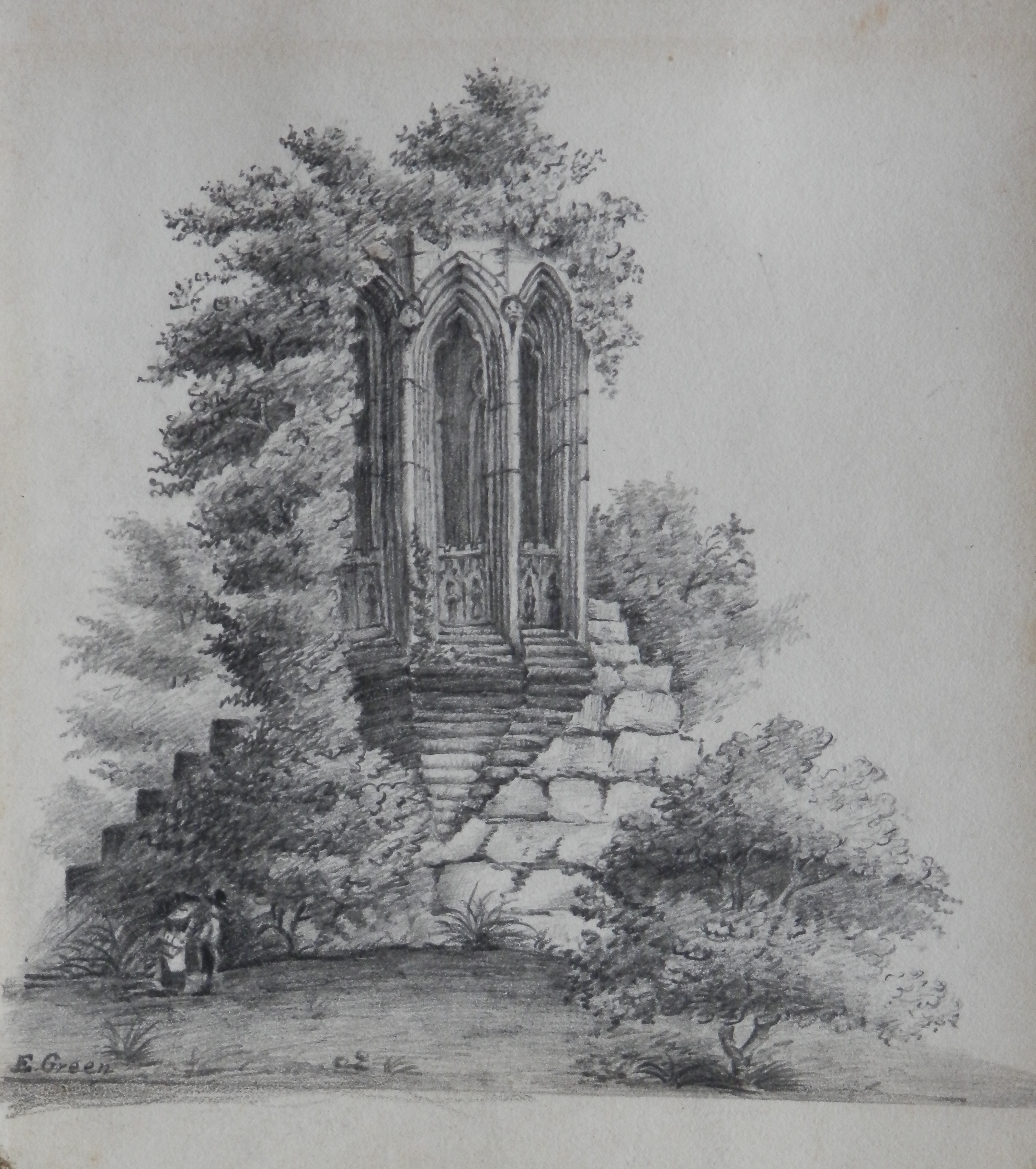 #EGreen has captured a ruin which has been overtaken by time and nature. The balcony appears to float in the air – what is left of the castle appears to be far too little to support the colonnades and weight of the balcony. It might suggest a lack of perspective by the artist but the remainder of the drawing shows a fine accuracy. So, likely this place does or did exist and what a place it would have been in its prime. The two people opposed by the ruin show the impressive size of the structure. The shading and detail in the arches and foliage is superb – even down to the sculpted faces at the top of the colonnades. Can you imagine Juliet leaning out of the balcony looking for Romeo – her beloved?