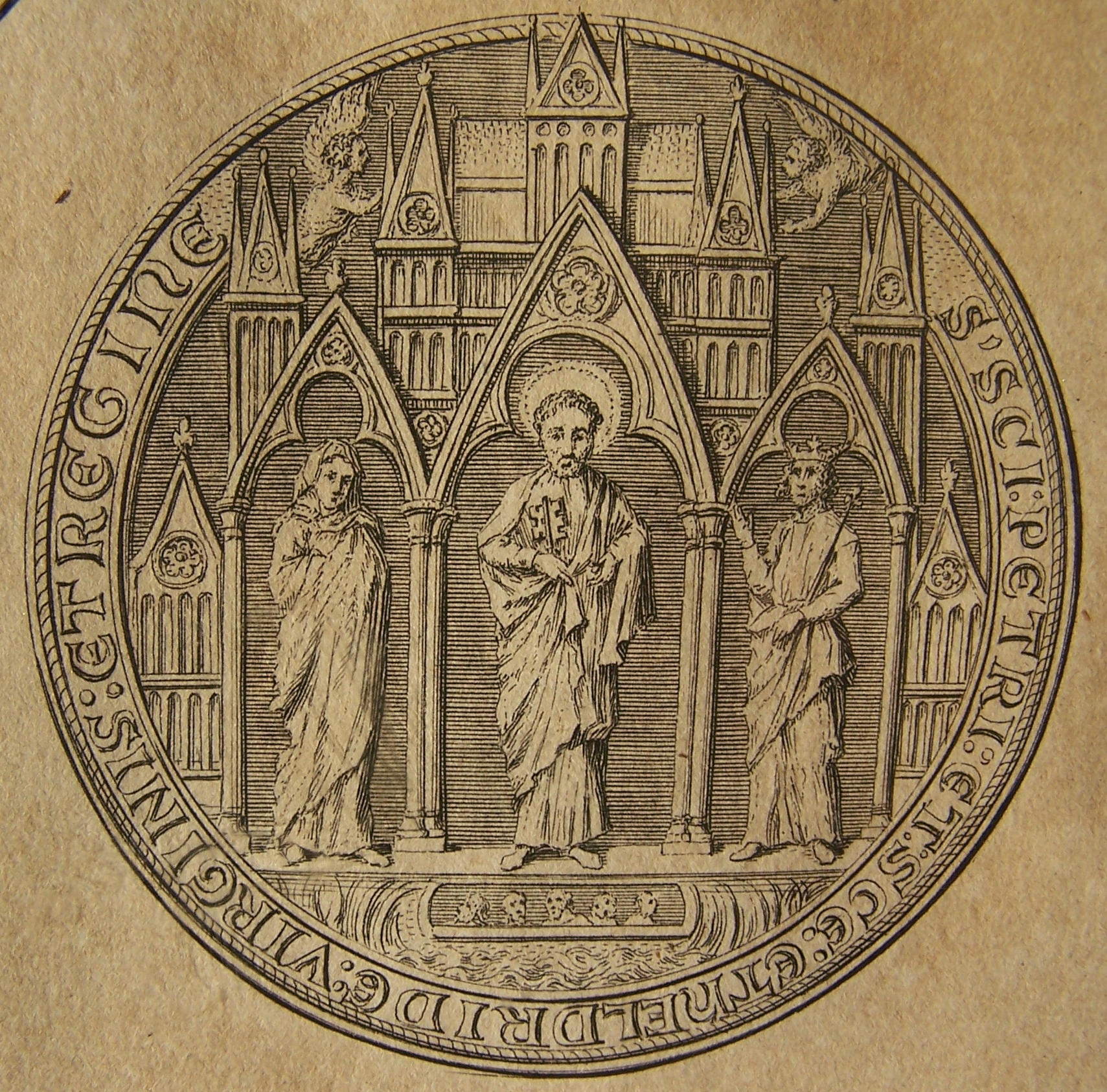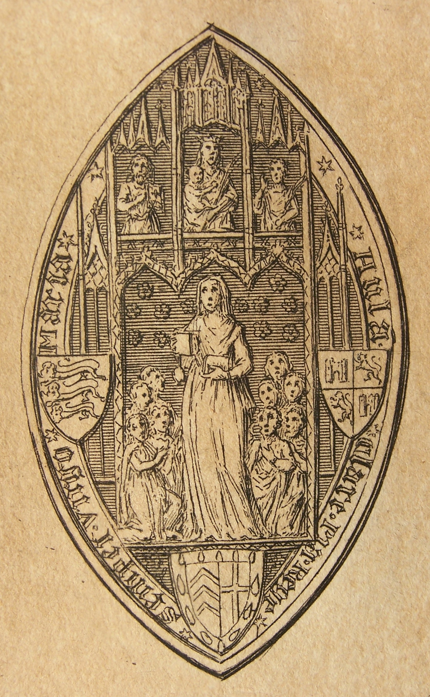 We see the #ElyCatherdalChapterSeal – the sigillum of #Etheldrda foundress of the monastic community at #Ely which later became the site of the bishop’s throne making Ely a cathedral. I can find little information on the seal and so believe it lost. I have found only one image of this seal on line and it is a very poor image itself. There is one more sigill on the print and that is the seal of Clare College in Cambridge. possibly a single sided seal for only one side appears to be imaged.