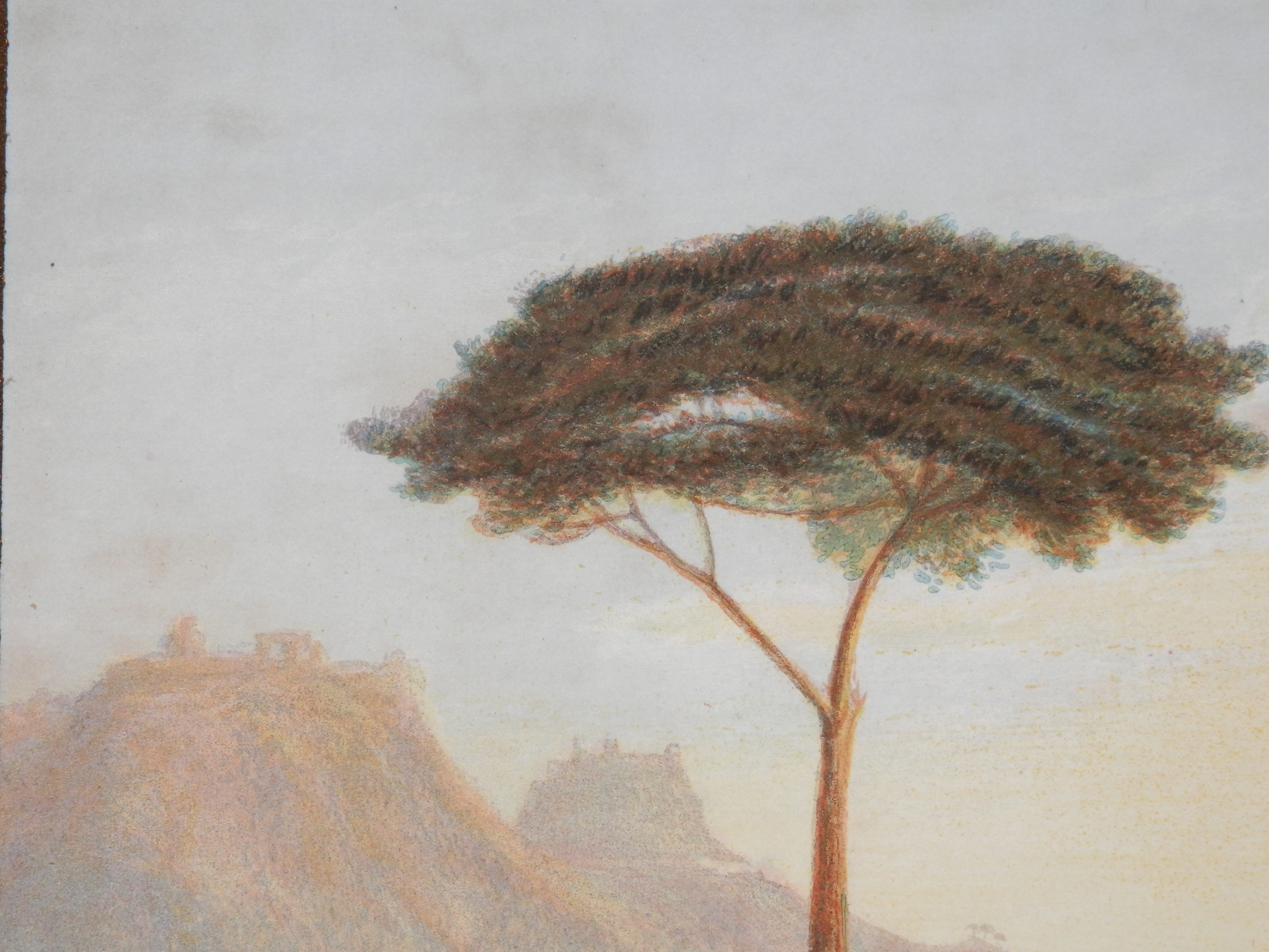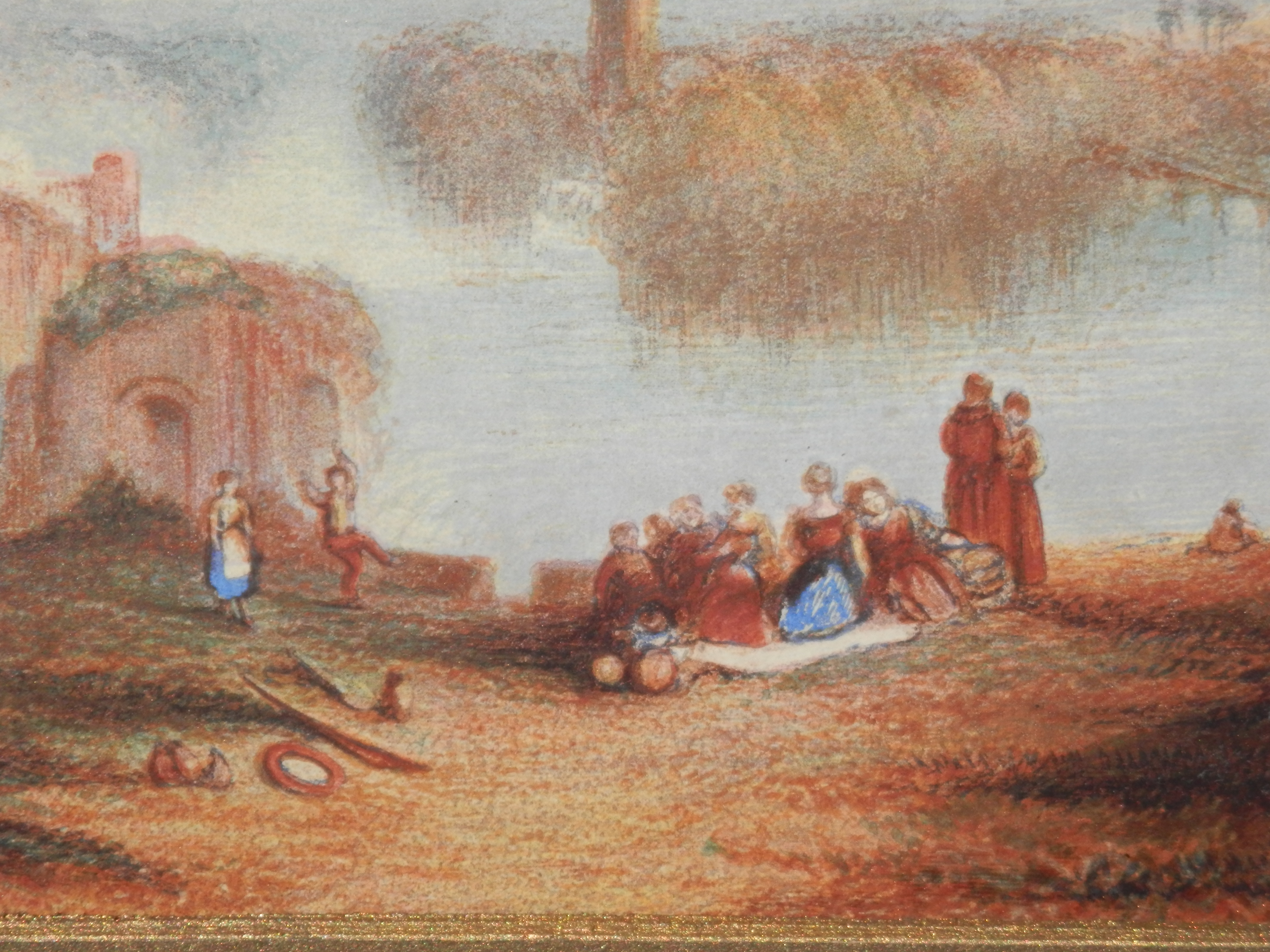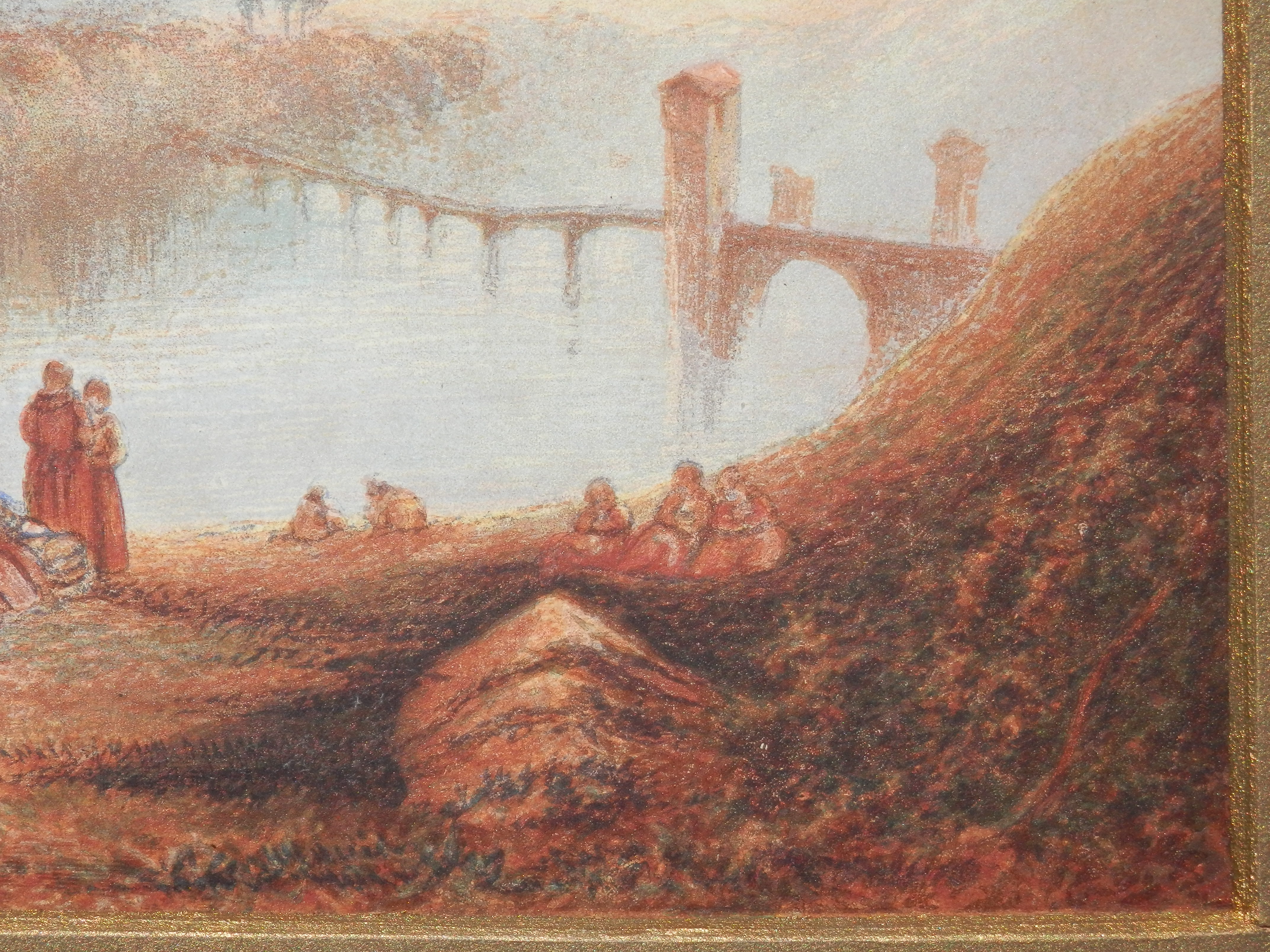The watercolour/gouache to the left is a very fine copy of the Turner oil painting which hangs in the Tate, London. I call it a watercolour for although the paint for the most part does seem to have been applied by brush it seems to sit in layers and not soak into the paper or the other colours as would be expected but that is how gouache works. Gouache paint is similar to watercolour but modified to make it opaque. A binding agent, usually gum arabic is present, just as in watercolour. Gouache differs from watercolour in that the particles are larger, the ratio of pigment to water is much higher, and an additional, inert, white pigment such as chalk may also be present. This makes gouache heavier and more opaque, with greater reflective qualities