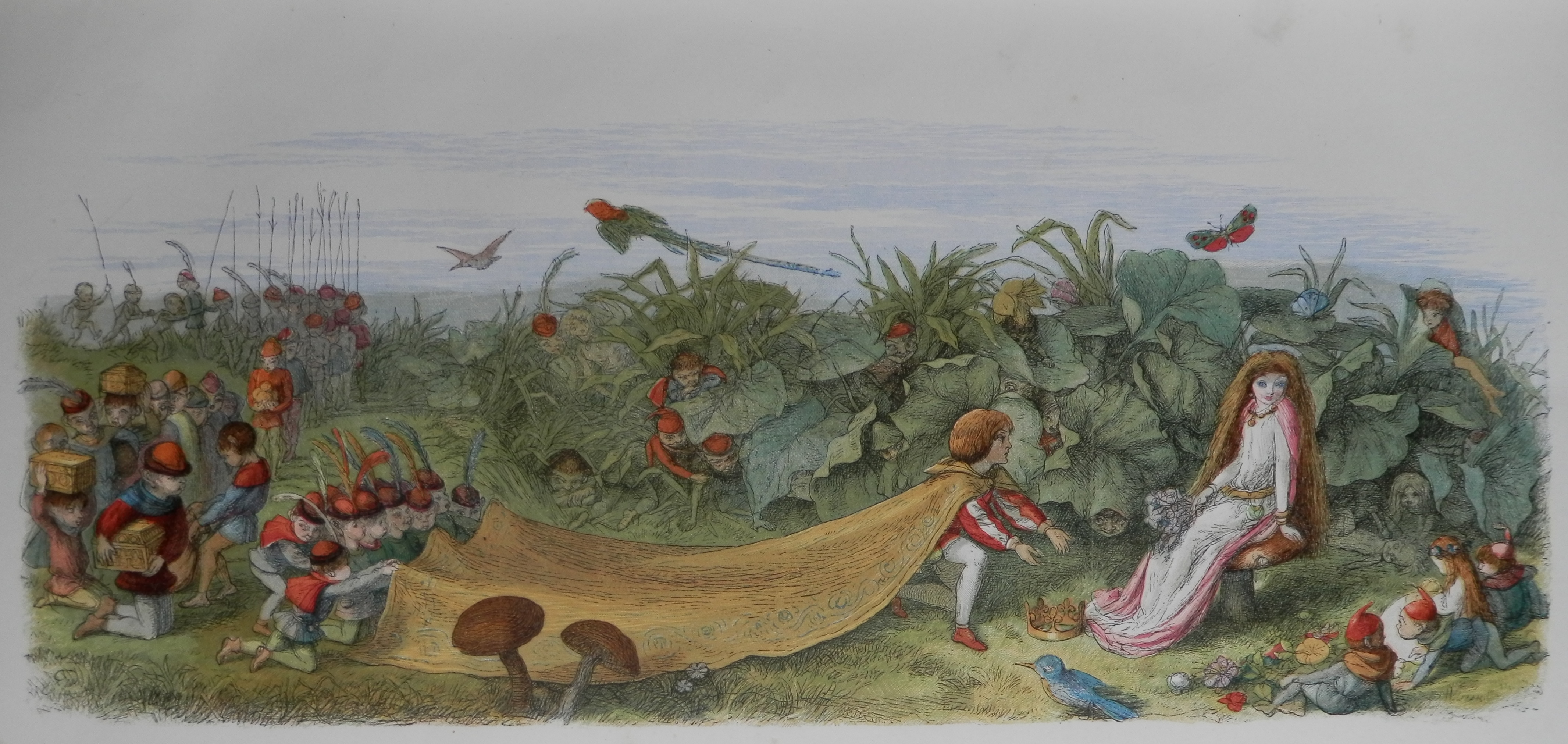 The book has been described as one of the finest examples of Victorian book production. It set a new standard in the milieu of book production. Luxuriously produced, with intricate engravings on wood by Edmund Evans ‘In Fairyland’ was designed as a treasure for households to cherish but, alas, it was priced at such a cost it was far too expensive for all but a few to buy. Only a few of the 2000 from the original print run sold. The remaining were sold as a re-issue in 1875 slightly altered from the original version.