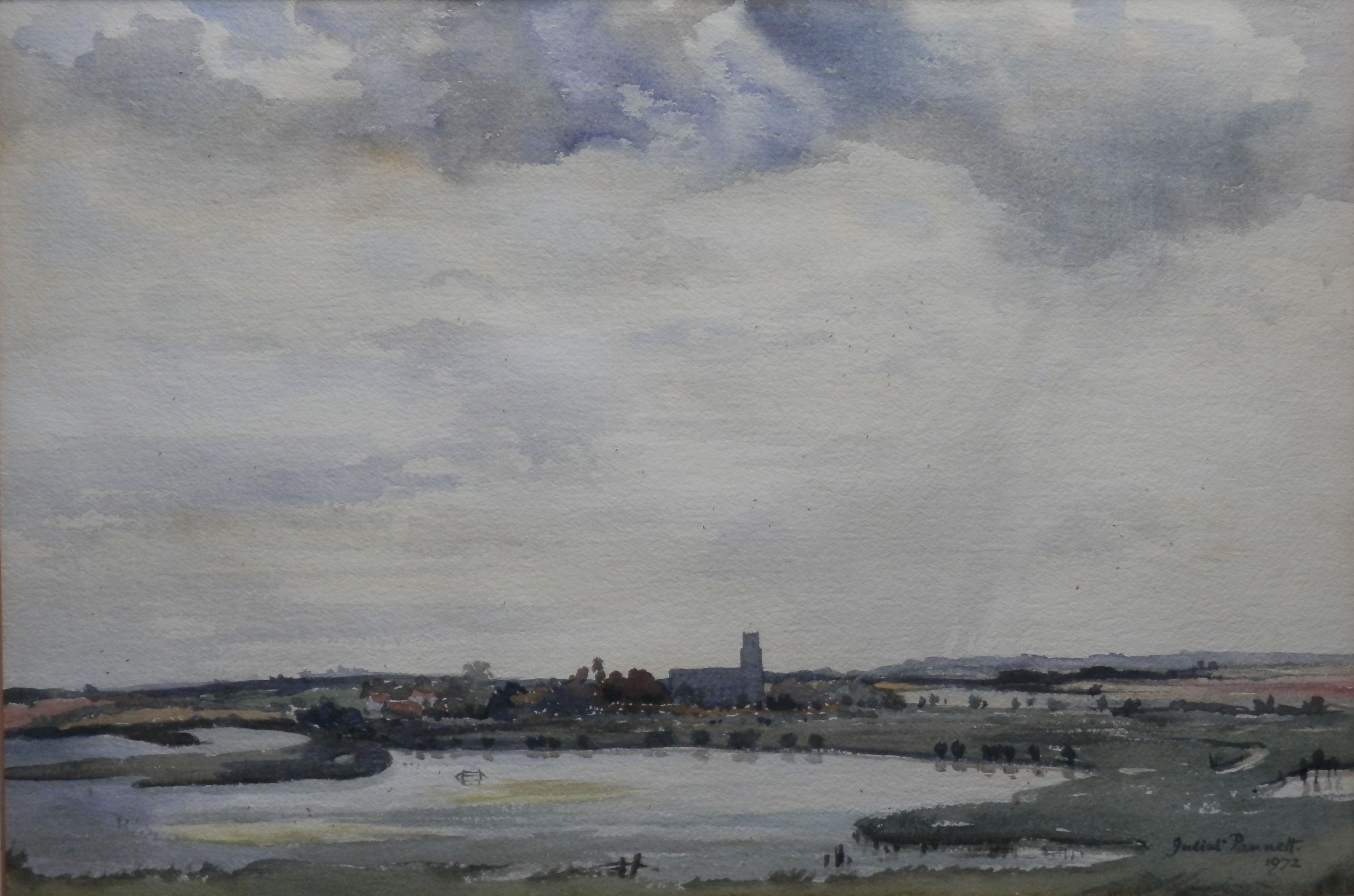#JulietPannett (1911-2005) is not known for her landscapes. She is a very respected portrait painter. Painting came naturally to her and by the time she was 17, she knew she wanted to paint portraits for a living. Commissions from The Illustrated London News and other papers began her professional career which led to her employment by the Illustrated London News. From 1957 to 1964 she had her own seat in the press gallery of the House of Commons. She portrayed over a thousand soldiers, intellectuals, politicians, musicians, fellow artists and ordinary British people. She painted nine Prime Ministers including Wilson, Callaghan, Heath, Thatcher, and Churchill. She has 21 portraits in the National Portrait Gallery collection in London. Her treatment of the wide open space and grandness of the sky exudes wonder and warmth. In simple strokes of colour a land is portrayed in beauty. One stands at the edge of this vista near #Blythburgh and is overcome by the vastness of sky as can only be felt and seen from a flat land.