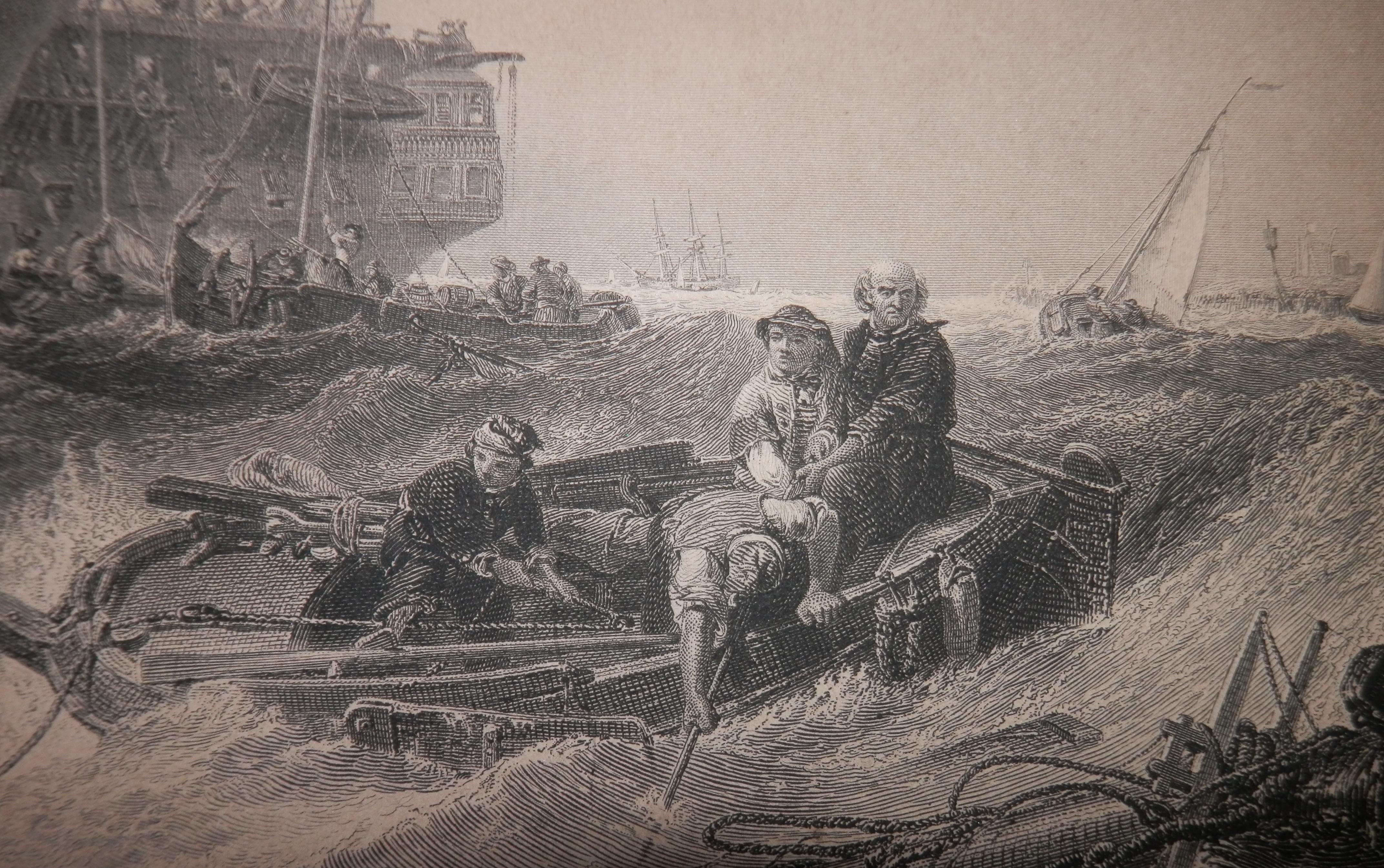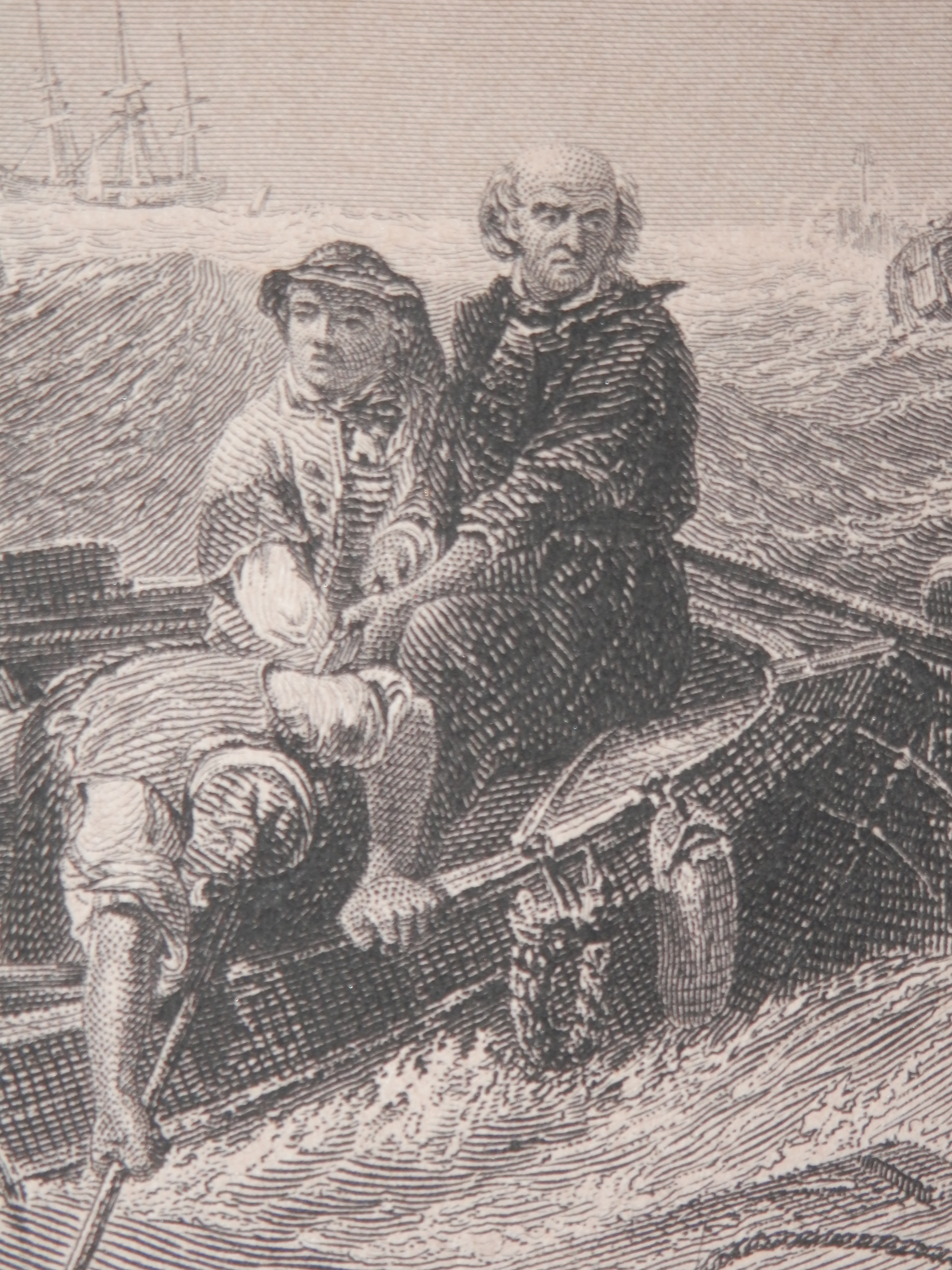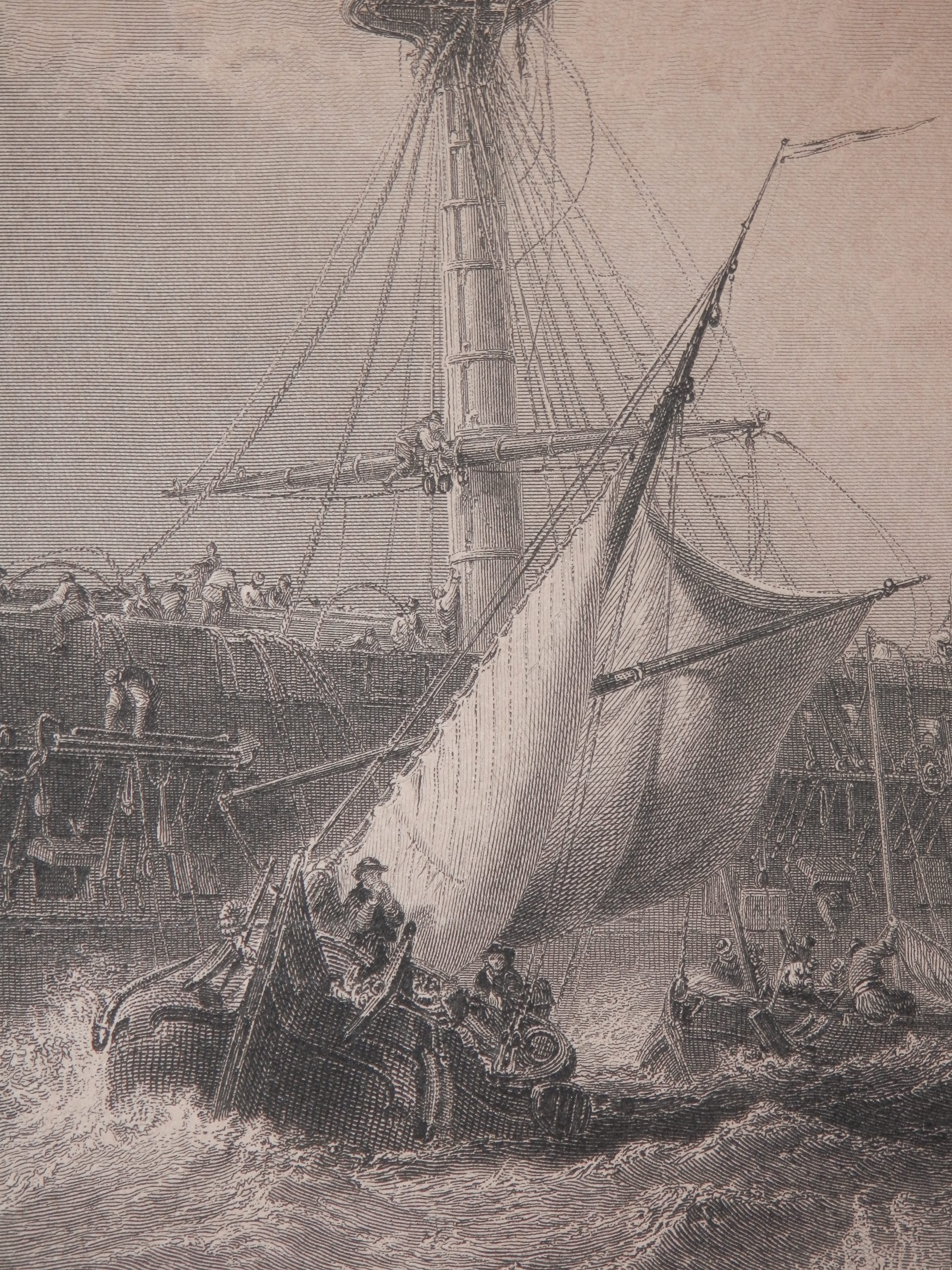 #TheMorningAftertheWreckofaDutchEastIndia-Man is this etchings full title. Etched by #JCousen after a painting by C Stanfield. Depicting the wreck of a freighter as it breaks up on a reef. A fine depiction of the sea and those who struggle against it. Here – a few insets to show how talented J Cousen was as an etcher.