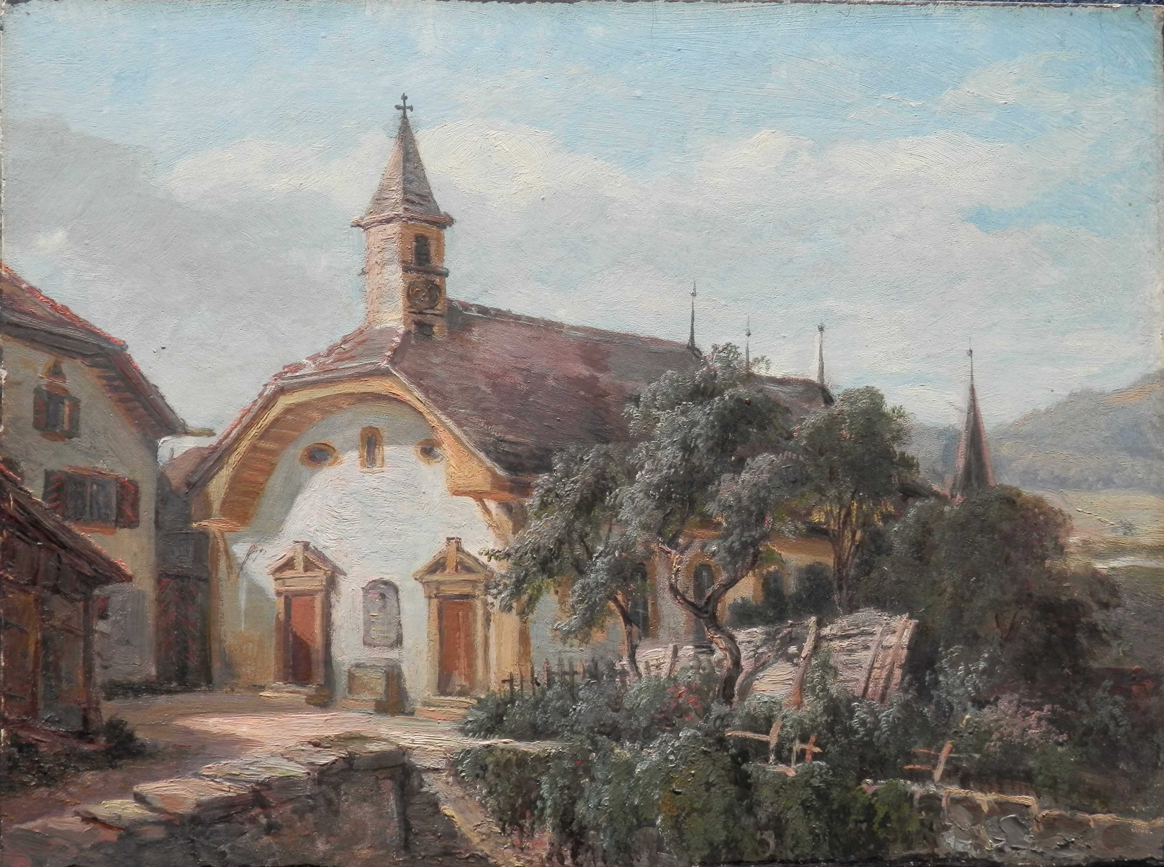 So to the lovely oil. Superbly done with brush and palette knife. Sublime technique. An eye for beautiful colour coordination and application. The subject is also very interesting since chapels/churches did not usually have two entrances. Male and female entrances – I don’t know but why. Possibly. A friend in France says the architecture looks like it comes from the Jura area of France. The sunlit front of the church may be the focus of the painting but for me the foliage of the tree, the wooden fence and the creeper growing on the stone wall show the real talent of this artist.
