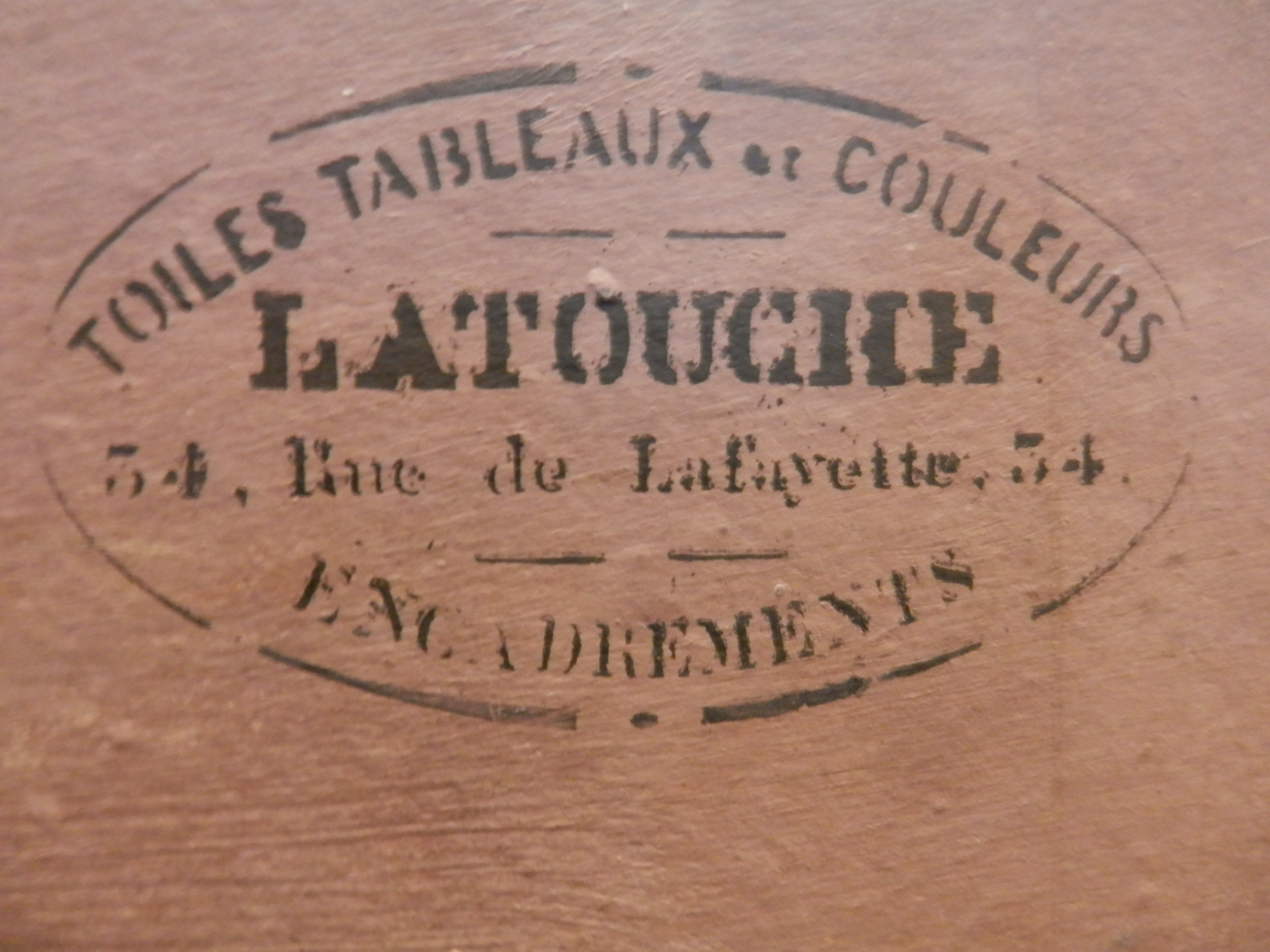 To the left is the stamp on the back of an oil painting I have added to my collection. A painting done in France somewhere between 1870 and 1885. Latouche’s wife ran the store from 1875 so that Louis could go back to painting. She sold the shop two years after her husbands death to Paul Contet.