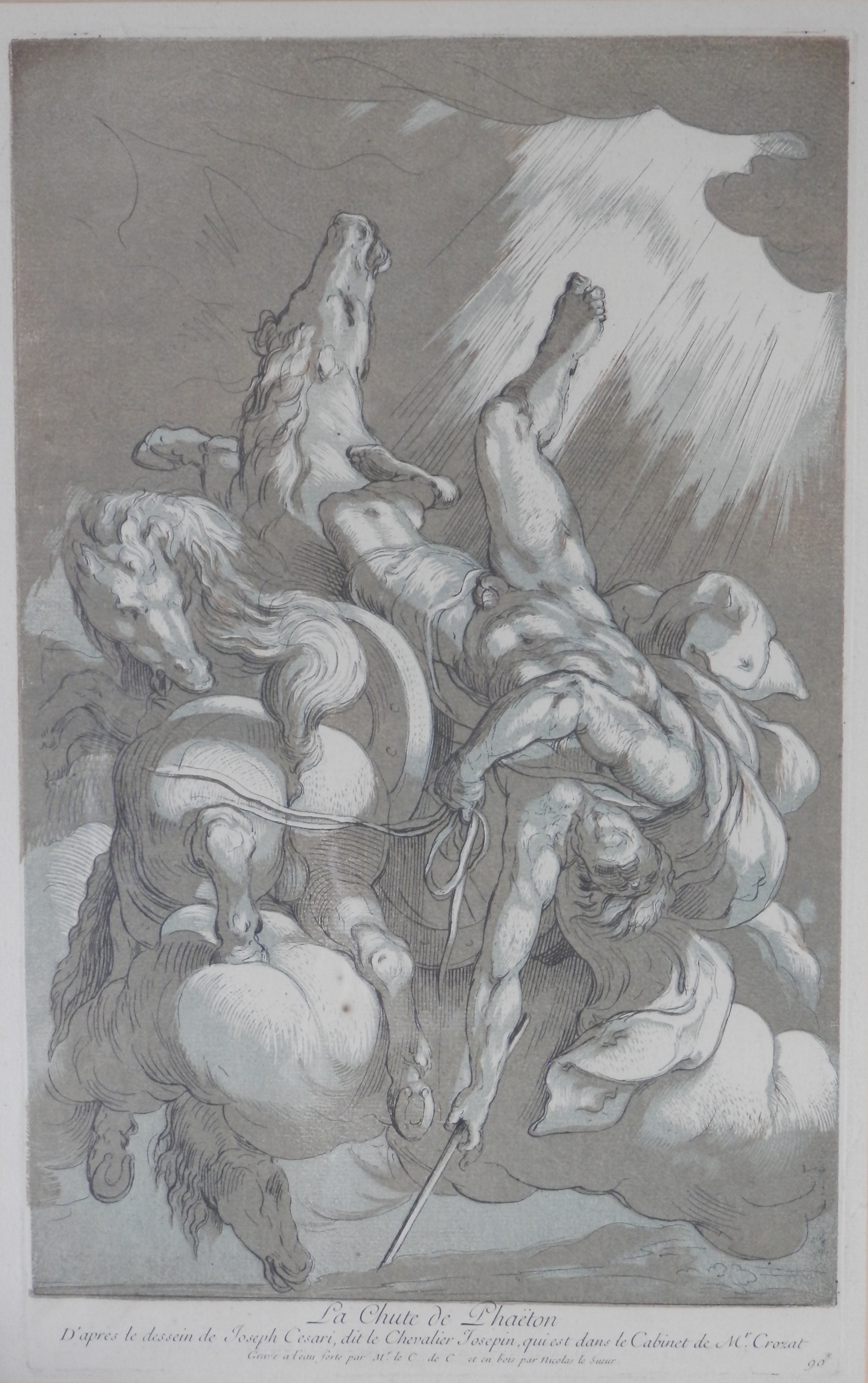 A superb woodcut which produces the black etched lines and then pressed with a brown wood block and then a green wood block. Cut by #NicolasLeSueur (1691 – 1764), the image is one of beauty. Amazingly engraved and finely pressed the page is a testimony to Le Sueur’s talent. The story goes that Phaeton wanted proof that he was the son of the sun god. He asked his father for some proof that would demonstrate his relationship with the sun. The god promised him whatever he asked. Phaeton requested to drive the sun chariot for a day. While driving the chariot, he was unable to control the horses and the earth was in danger of being burnt up. To prevent this disaster, Zeus killed him with a thunderbolt.