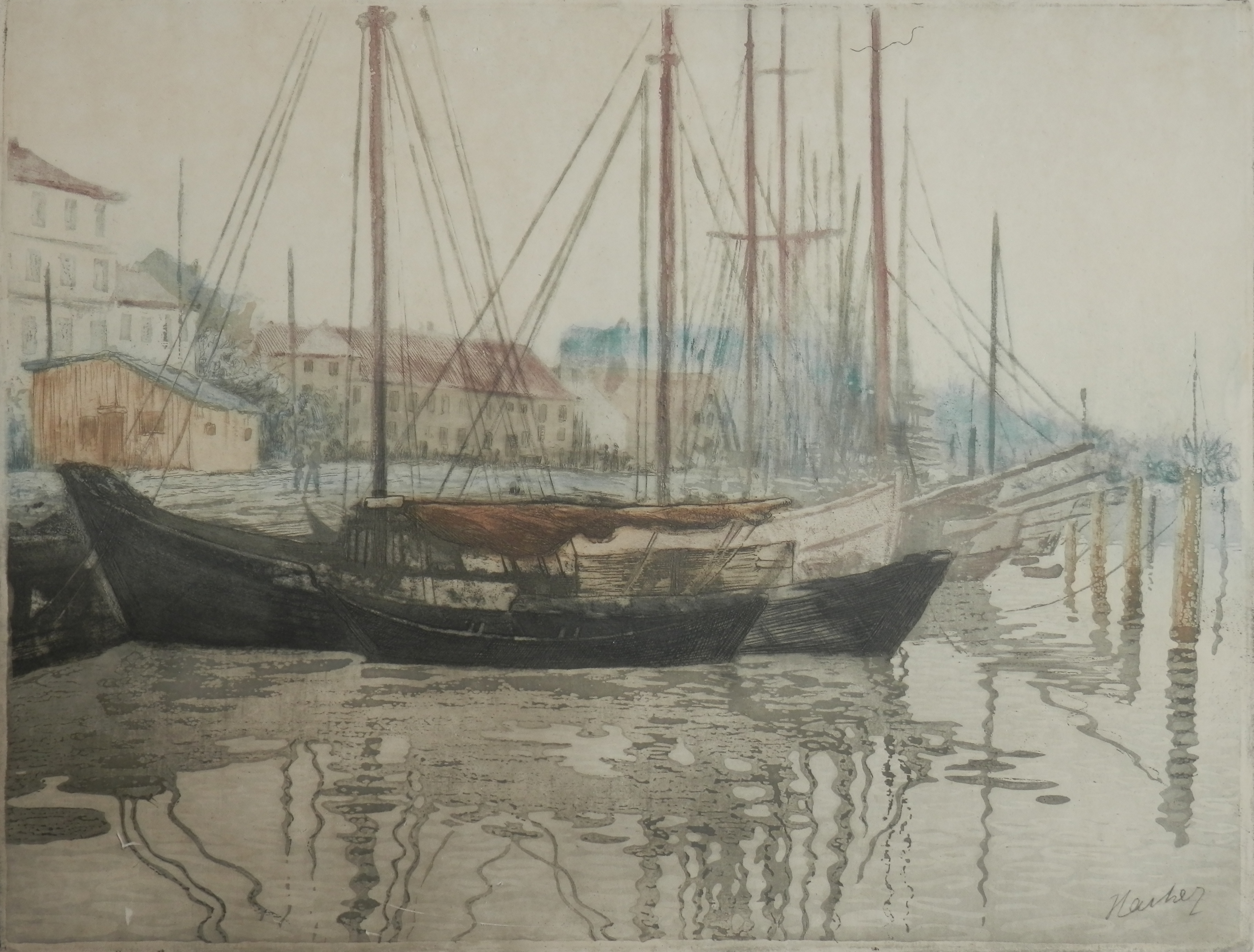 A fine etching by German artist #KarlHachez of the fishing fleet docked at Swinemunde. Karl (or Carl) Hachez was born in 1880 in Oldenburg, Germany. He based himself in Berlin and was known as an etcher, portrait painter, landscape painter and poster creator. He studied art in Berlin and Paris. A poster designer in Germany during WWI meant creating visually arresting images incorporating graphics, words and images. Communicating through those words, colours, and shapes the intended message. Often a message of nationalism or to encourage support for the war in which they were engaged. He died in 1958.