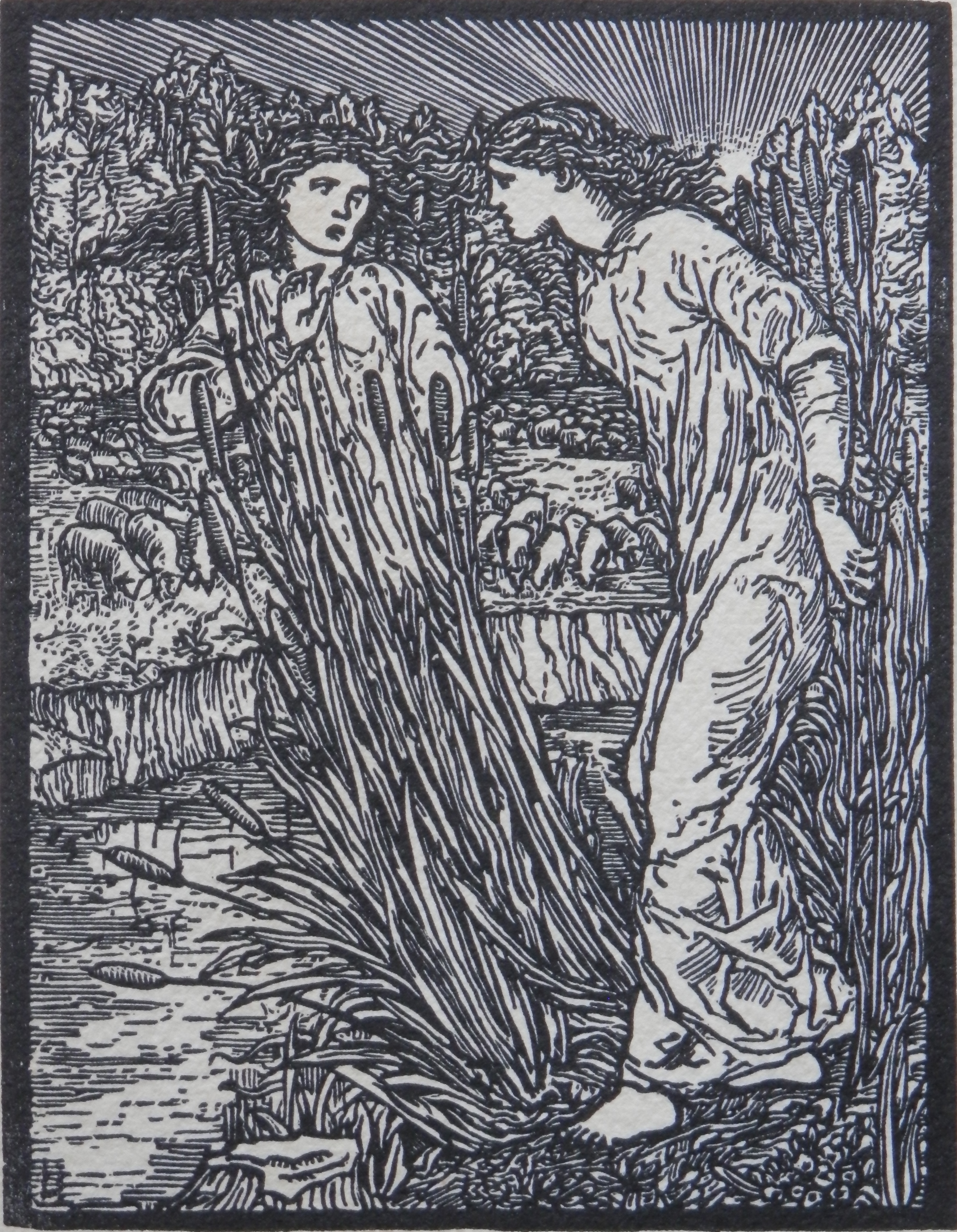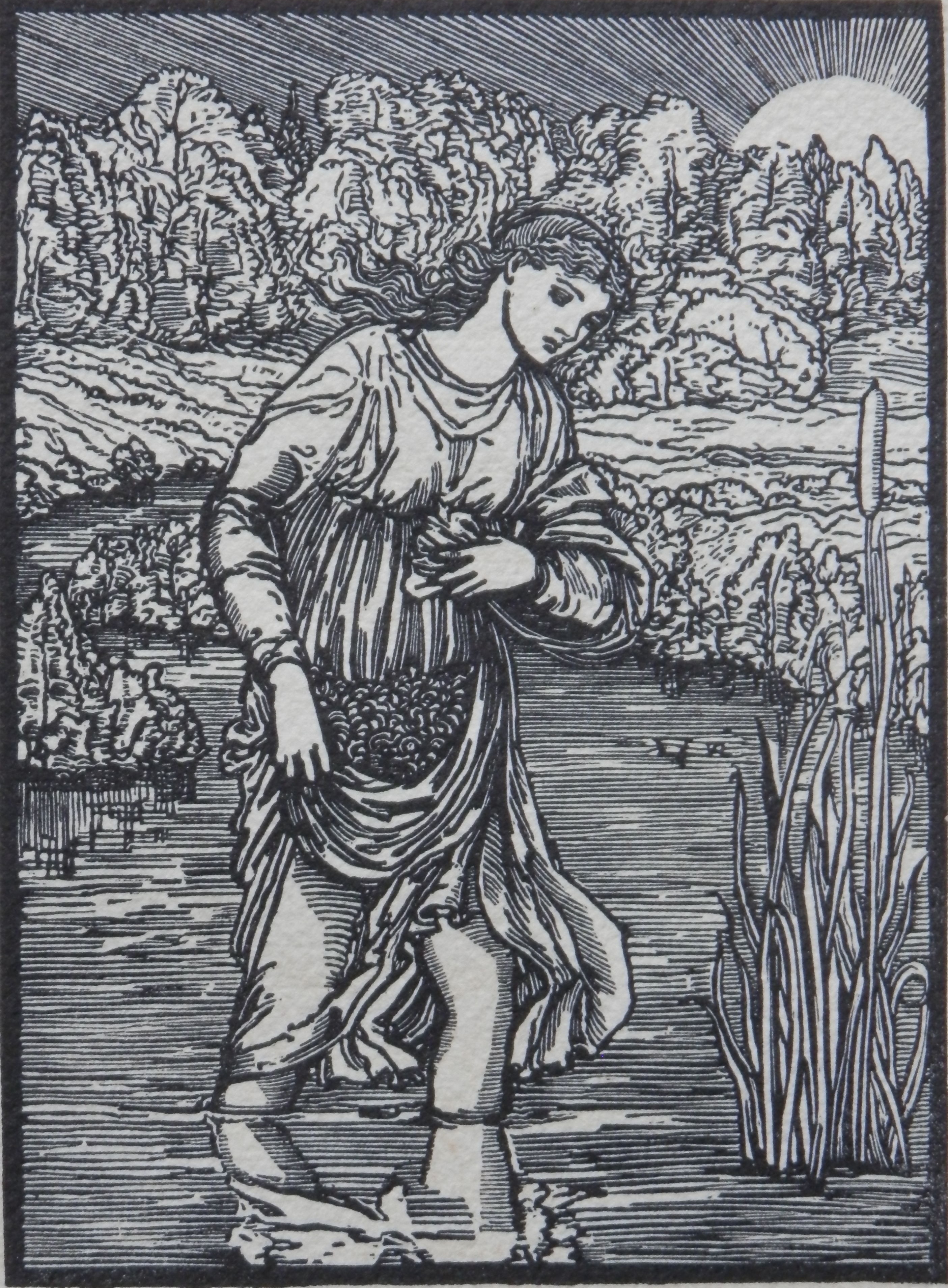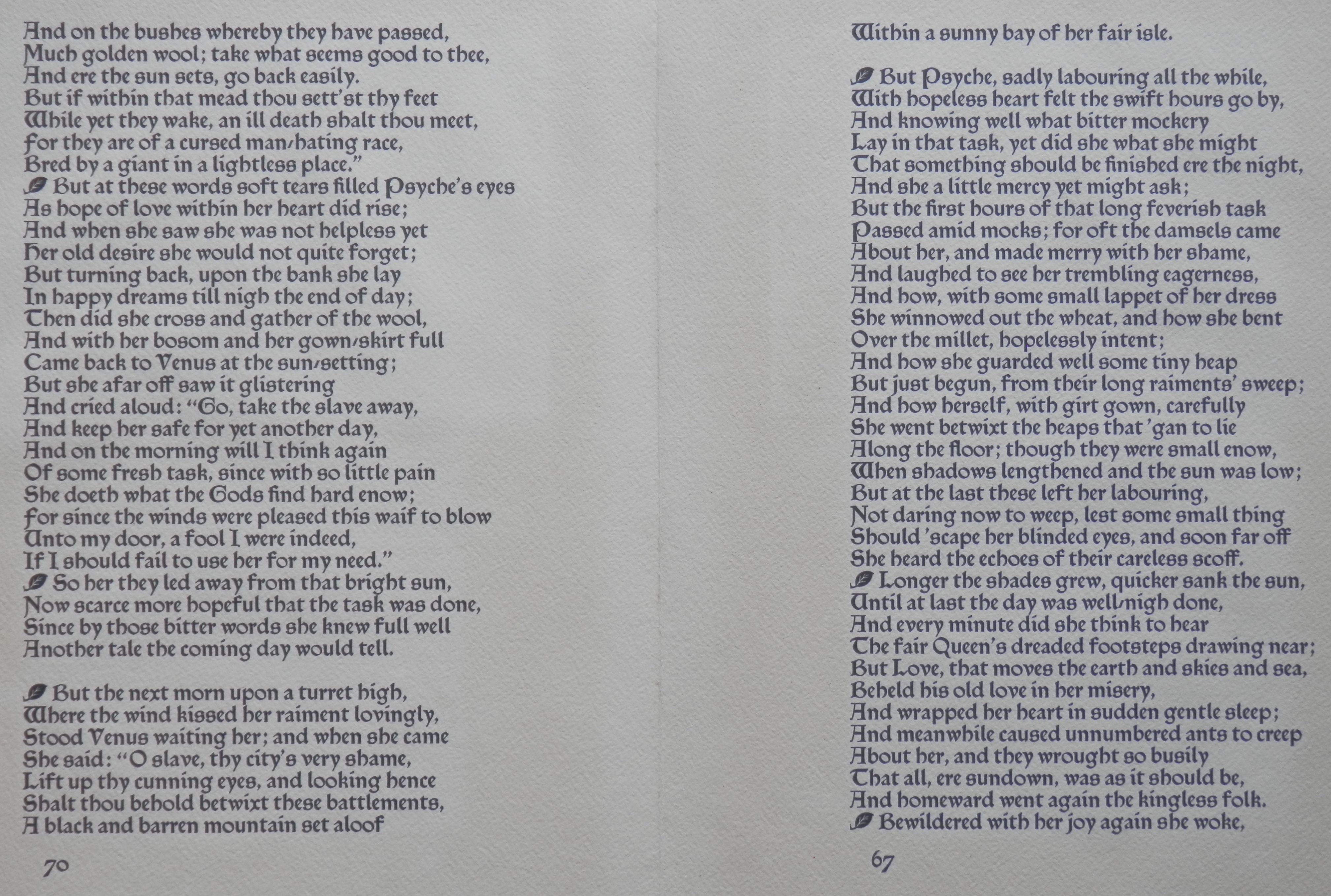 Although his epic poem was published with great acclaim in 1868-70, the woodblocks and engravings for the images which Morris created from Edward Burne-Jones’ drawings for a later lavishly illuminated version were never used. Trial tests were done but the union of text and image was found wanting and the project was shelved. In the 1880’s a small number of sets (total number unknown) were printed in another hopeful trial. But it was not until 1973 that the illustrations and poem were re-united and successfully printed by Will Carter at the Rampant Lions Press, in Cambridge. Carter printed from Morris’ original woodblocks and some of the original Troy type from the Kelmscott Press (now in the Cambridge University Press collection) to complete a limited run of the book in 1974.