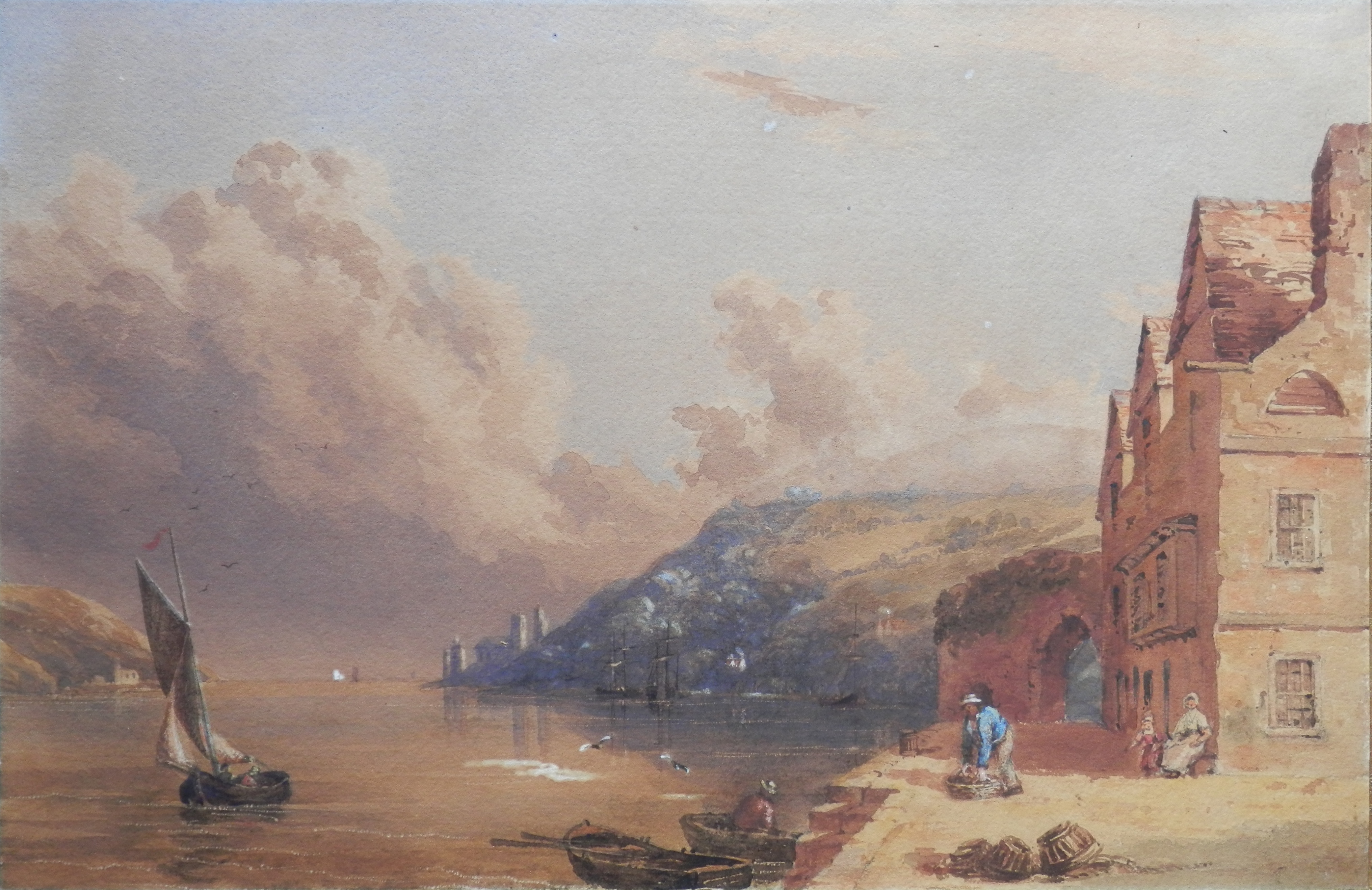 We begin with a coastal or harbour scene in the manner of Samuel Prout. A warmth of colour and precision in expression are the proof of this artist’s talent. I believe it to show #Bayard’s Cove on the River Dart near #DartmouthHarbour around 1860. We see #StPetroxChurch and castle towers in the distance at the mouth of the inlet.