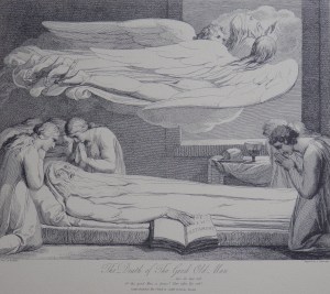 While here are perfect repose, a strong hope, and heavenly rewards. Peace lies upon the old man’s visage, his hand upon the gospel, the bread and the wine having been received his soul devoutly ascends to eternal bliss. His affectionate children are seen in supplication, prayer and thanksgiving. No fear or desperation clouds their countenance. How great is the happiness of the Good Man in the Hour of Death.
