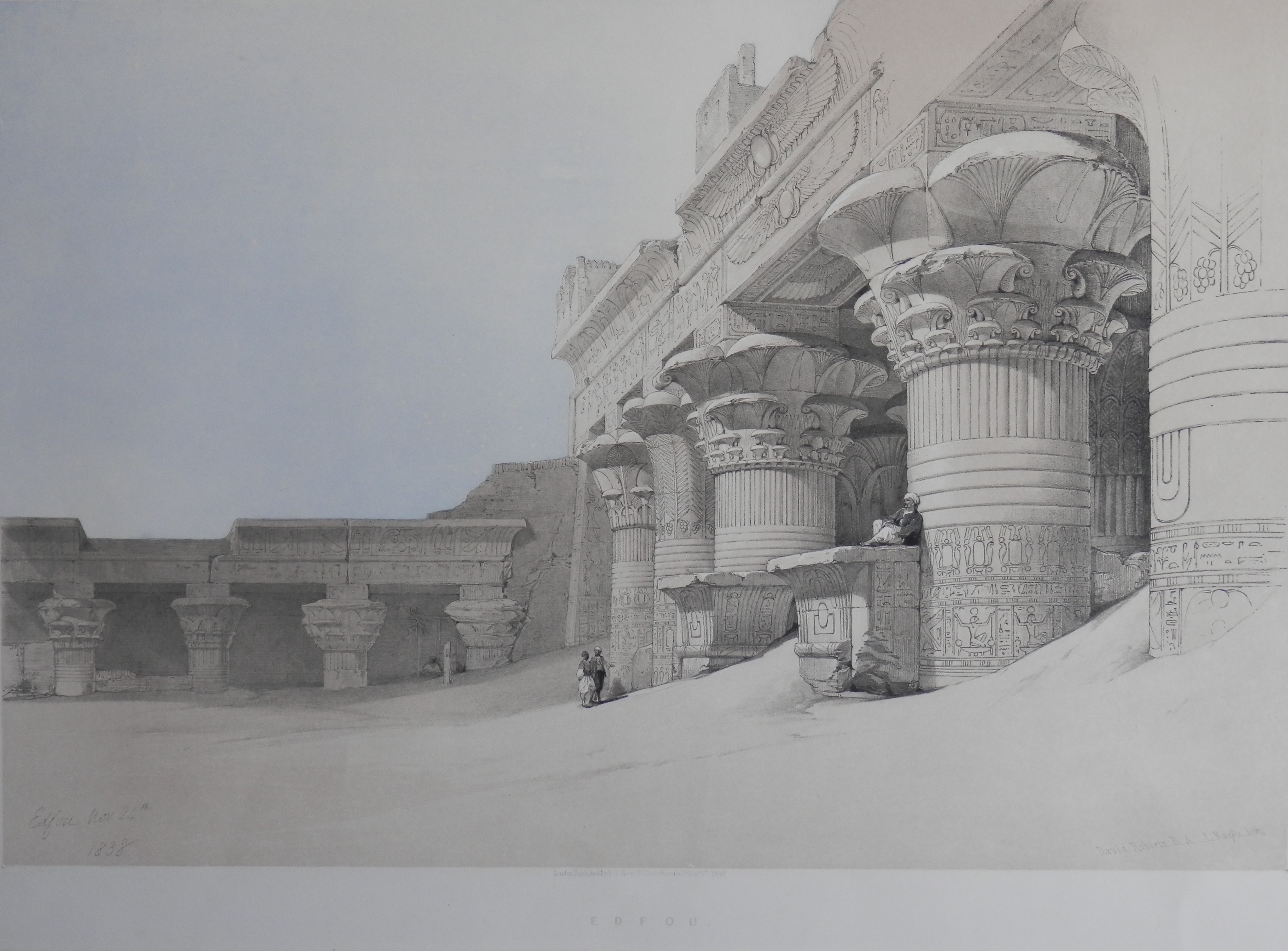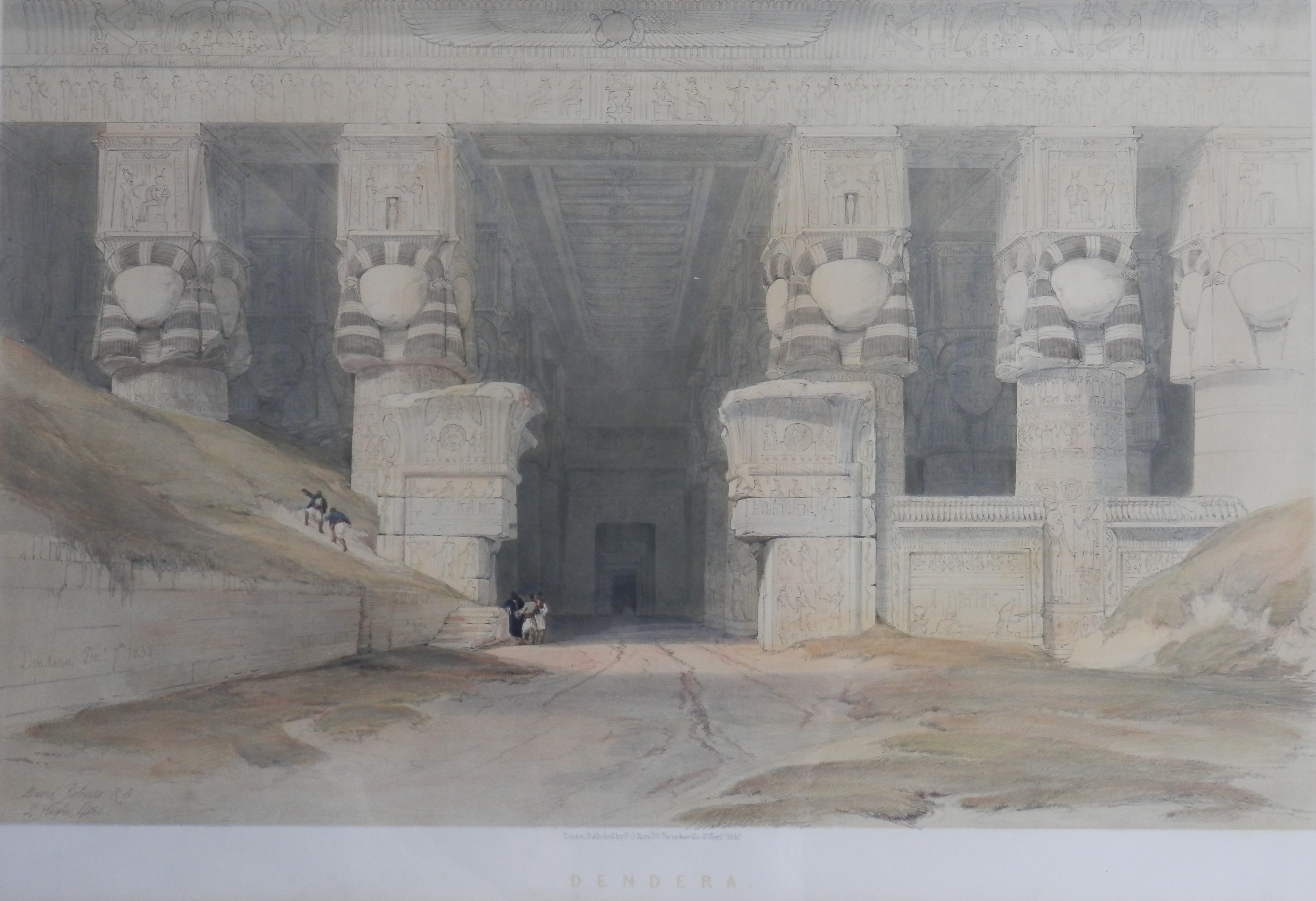 It was JMW Turner who convinced Roberts to become a full-time artist and the result was Robert’s travelling to Egypt. The intent was to create drawings and sketches which would later become paintings and lithographs available to the public. A vast number of drawings and watercolour sketches were produced and on his return to England a collaboration with lithographer Louis Haghe was established. The lavishly illustrated plates were created between 1842 and 1849. The images of Egypt and the Holy Land were quite popular in Britain and as luck would have it, Roberts published prior to early photographers also publishing images.
