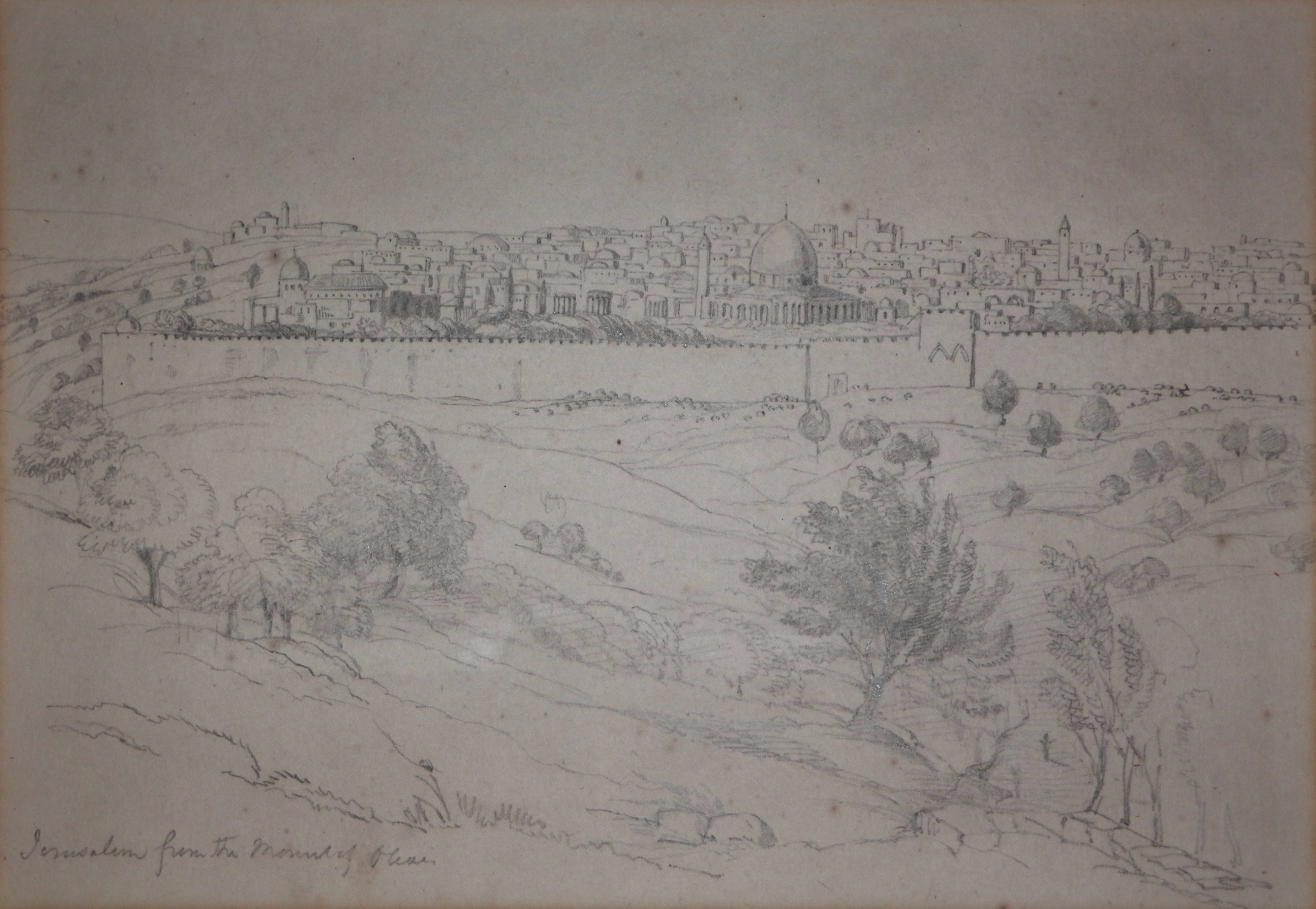 I had dated this drawing to 1850-1870 by the number of graves which can be seen in front of the city wall. The curious thing which I have noted is that if one looks at the left hand edge of the city the wall which should (I think) jut out from where the domed building appears then run across the terrain back and up to the distant towers on the high distant hill is not there. This may mean that the drawing maybe from around 1820. I continue to research where this wall should be and when it should have been.