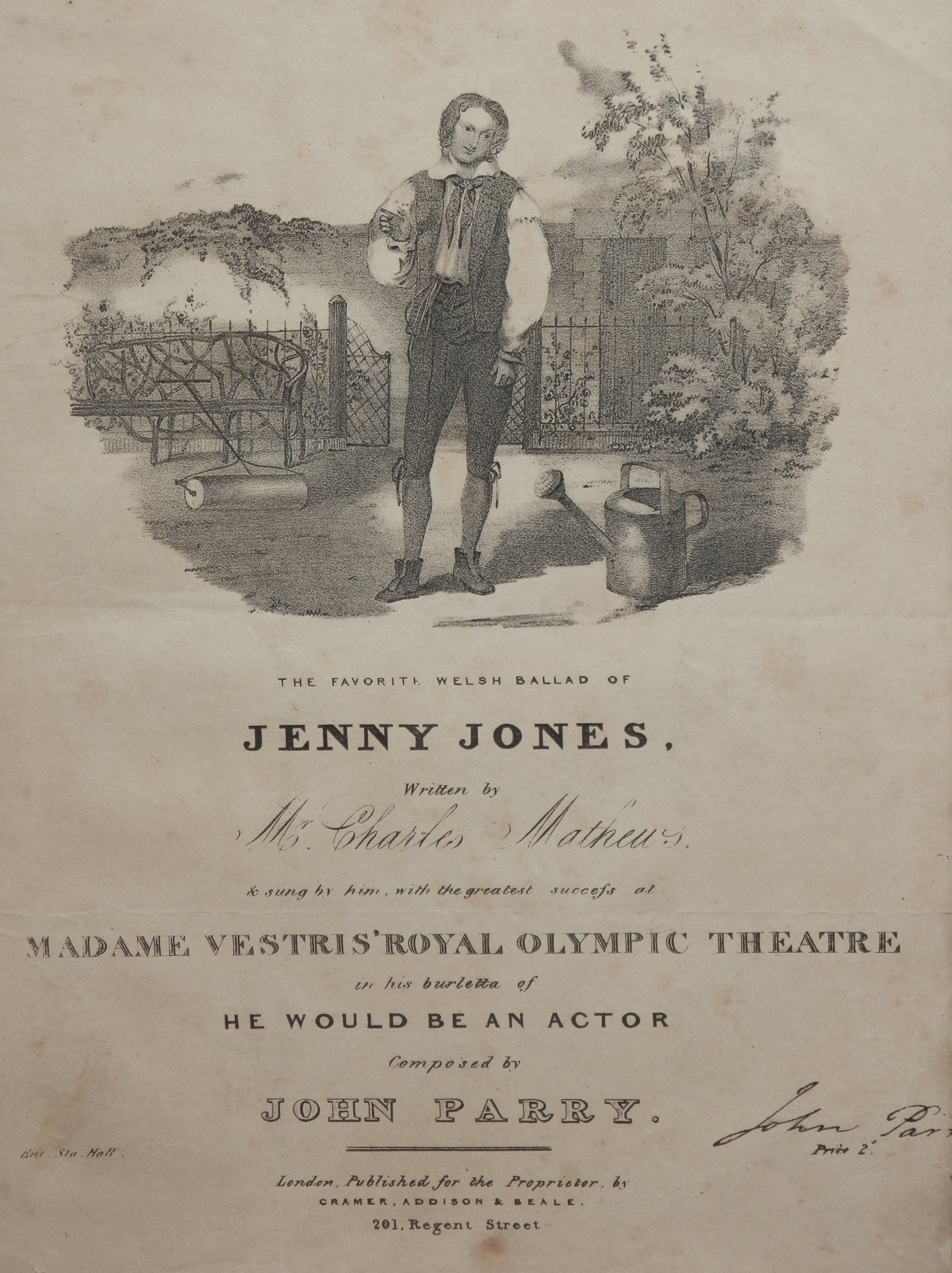 Let’s begin with the edition of Welsh ballad #JennyJones composed by #JohnParry (#BarddAlaw) with lyrics by #CharlesMathews in 1804. The artwork on the cover is unsigned so I cannot credit it but it is of good quality. The other interesting part of the cover is the signature of the composer Mr. Parry. I believe it was etched into the original plate from which the cover was printed. A beautiful piece of music and age has for me made the paper more beautiful. To touch paper of this fine quality, to smell the ink, to admire the artistry of the printer and artists design.
