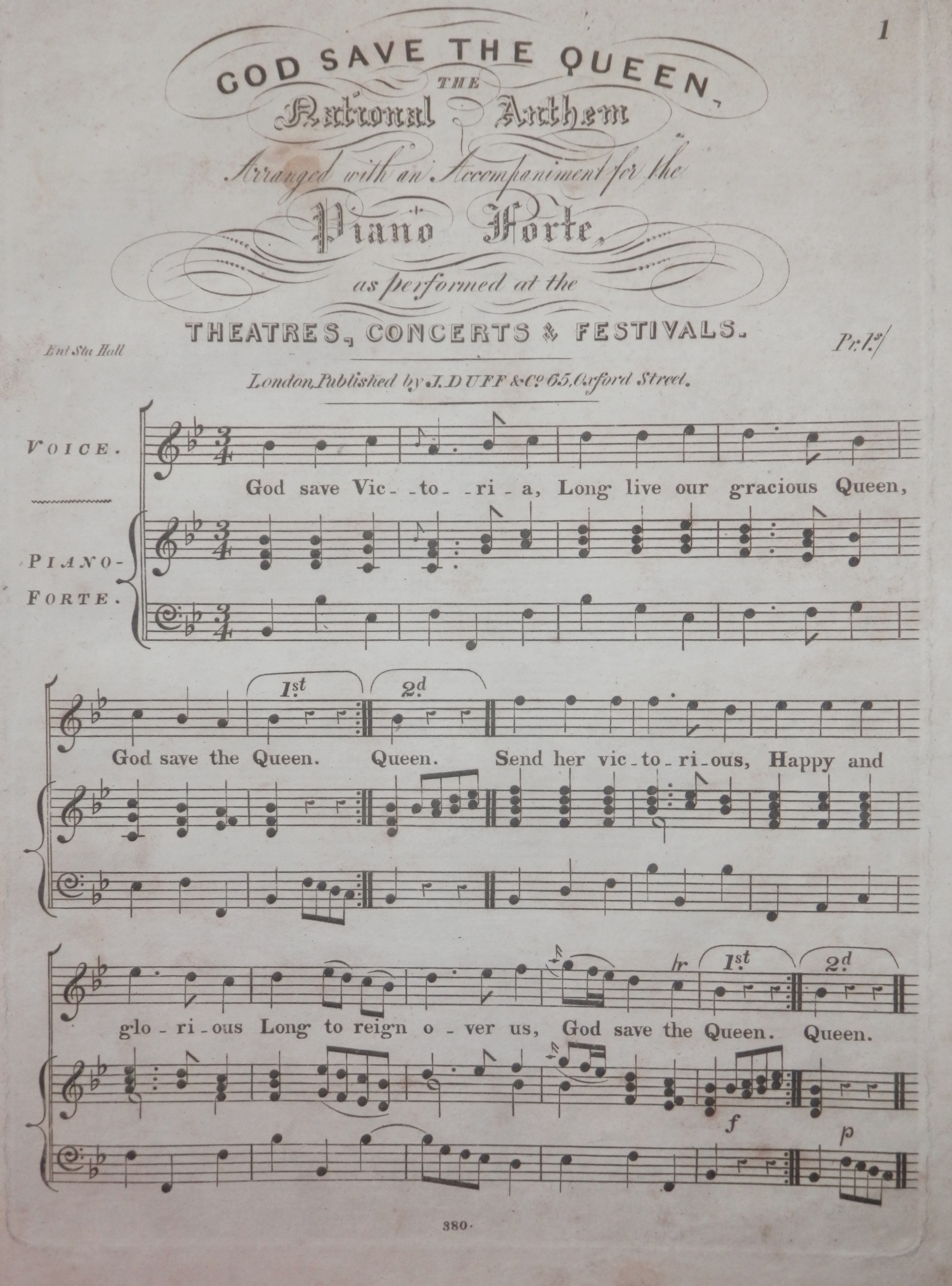 And we will go to a version of #GodSaveTheQueen published by J. Duff around 1837. This would have been published right around the time when the words went from God save the King to God save the Queen. Once again the the quality of the printers workmanship is admirable and I also love that the plate marks are visible on the paper. Enjoy. Some other pieces next chapter.