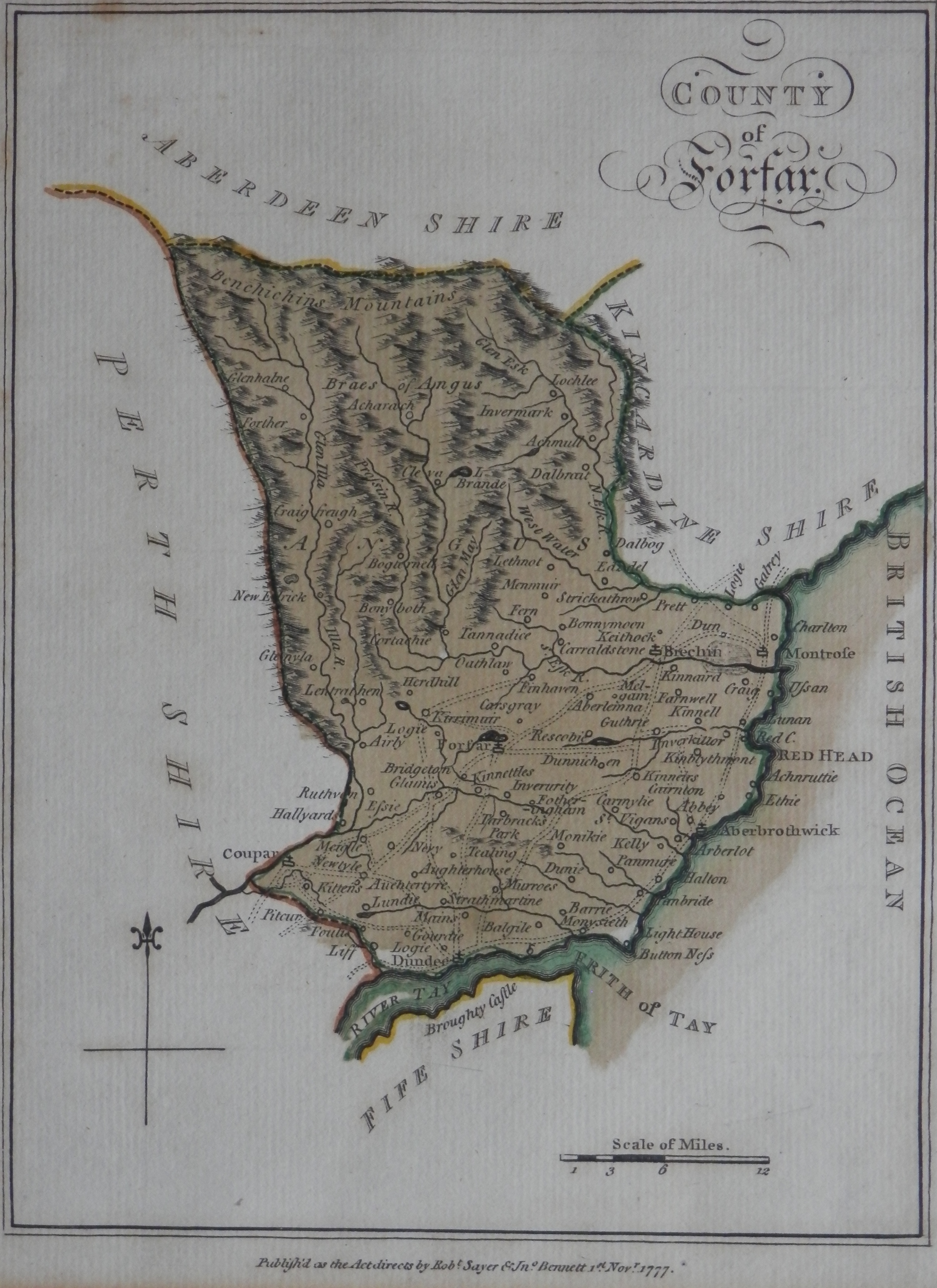 We begin with a map by an unaccredited cartographer. The map of the #CountyofForfar was published by #RobertSayer & John Bennett. Sayer and Bennett began trading in 1774 although their formal partnership was recognised in 1777. It ended in 1784 when Bennett suffered from a mental collapse. Robert Sayer began selling prints in 1748 and grew his business by taking over other printers and publishers. Sayers bought the businesses of Philip Overton, Herman Moll, John Senex, John Rocque, Thomas Jefferys, and Henry Overton. This would have made him a force to contend with as a print maker and map seller. He would have employed a great number of etchers and engravers all working under his direction.Forfarshire is the official name of the historical county of Angus. This hand-coloured map is a fine example of early cartographic publishing. I love the description of the body of water on the right hand side as the ‘British Ocean’.