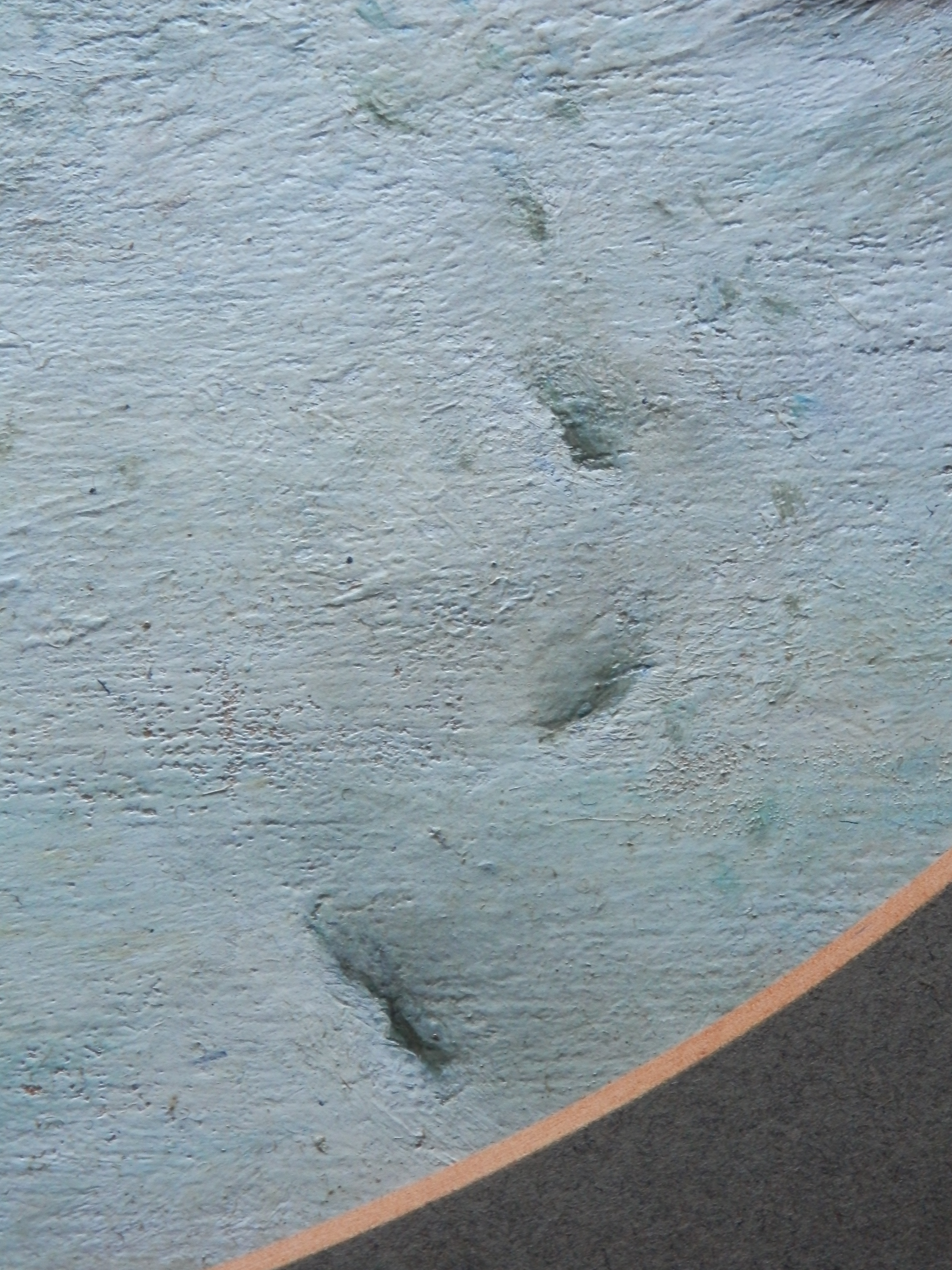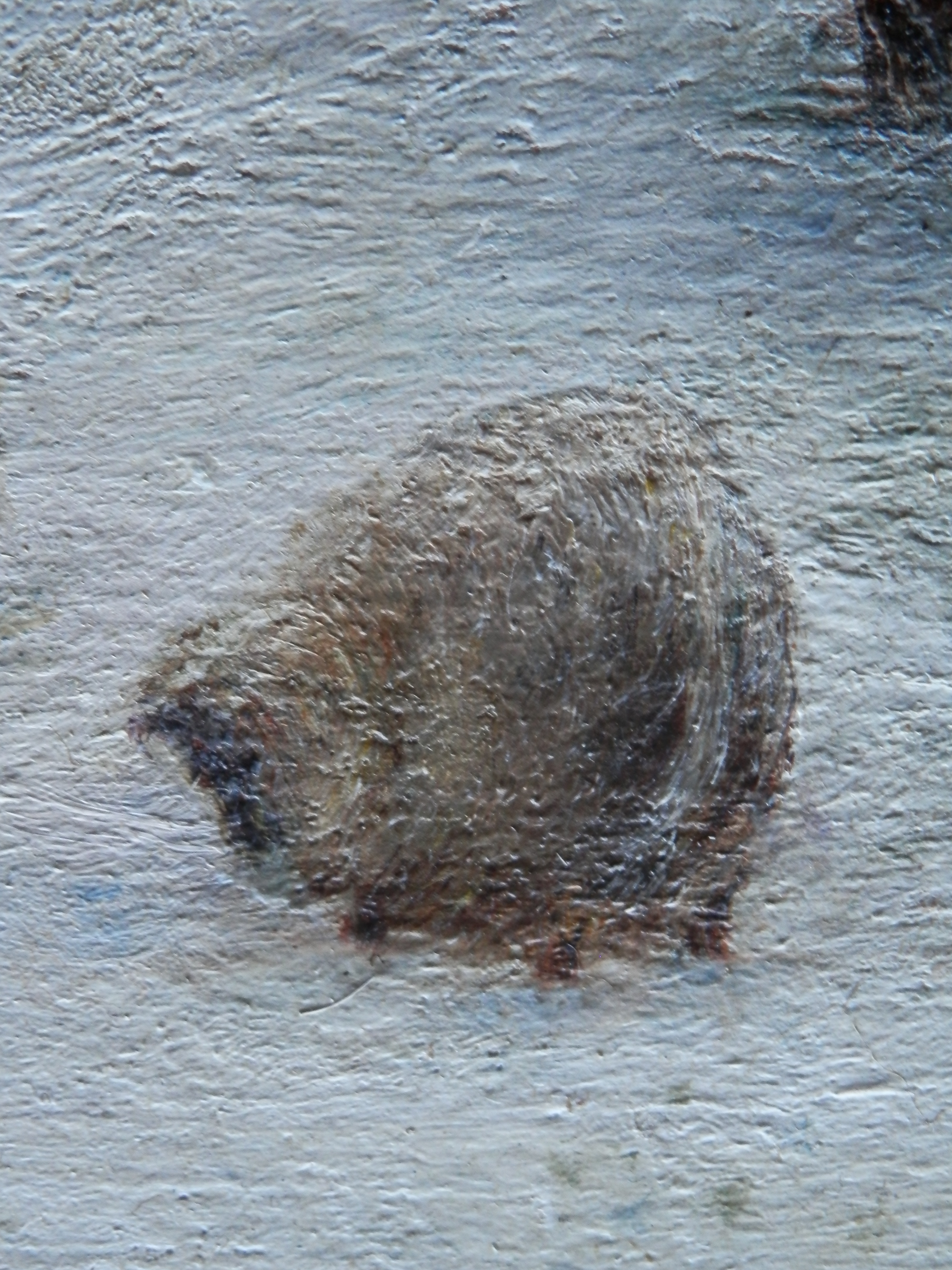 I have tried to add a number of close-up photos of the painting so that you might appreciate the finesse and quality of this artist. I really love the depth and 3D effect which he achieves in the painting of the footsteps in the snow.