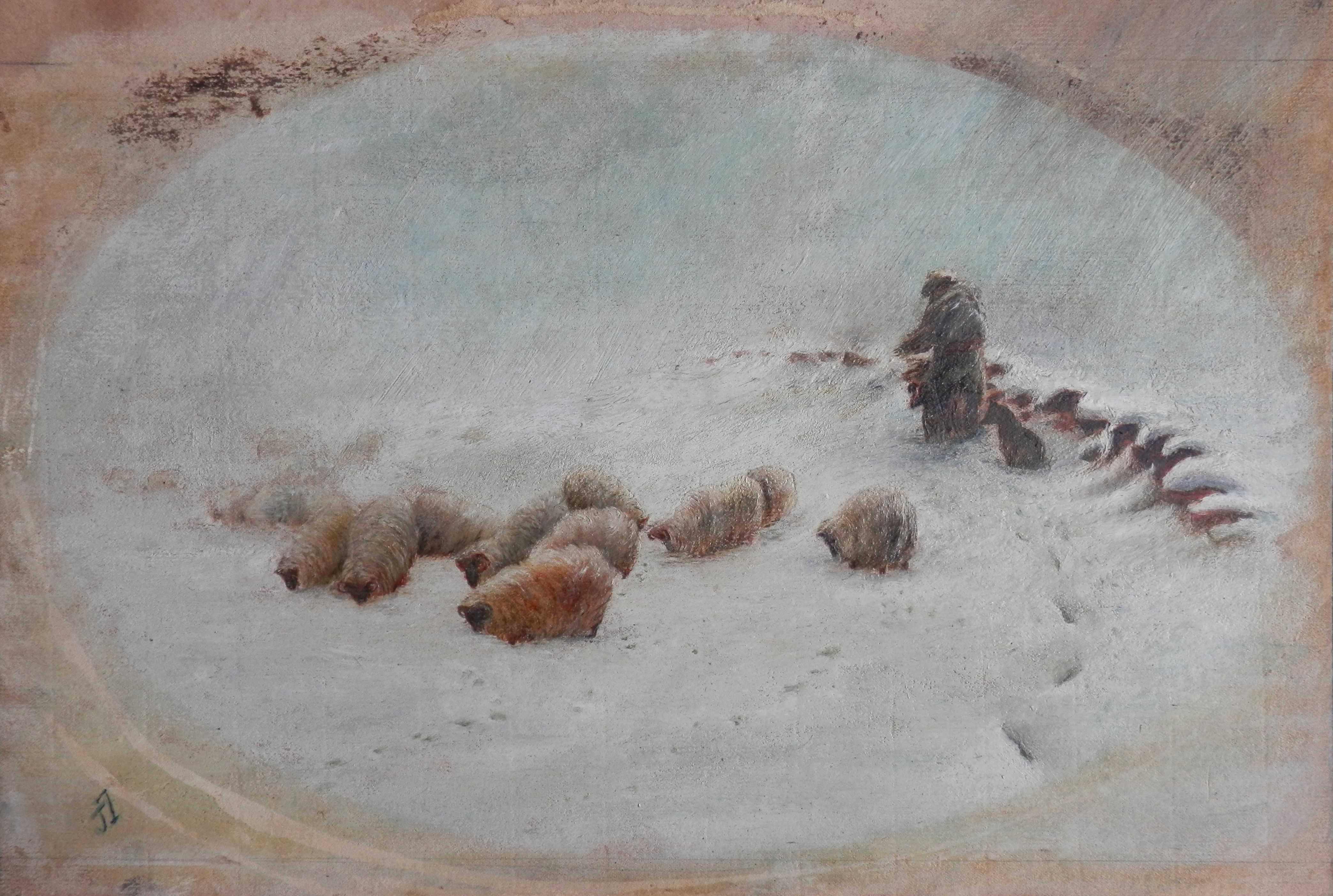 Farquharson was known for his winter landscapes – there is usually a human – a shepherd or farm labourer – involved also. Many of the landscapes come from the countryside around his home Finzean.