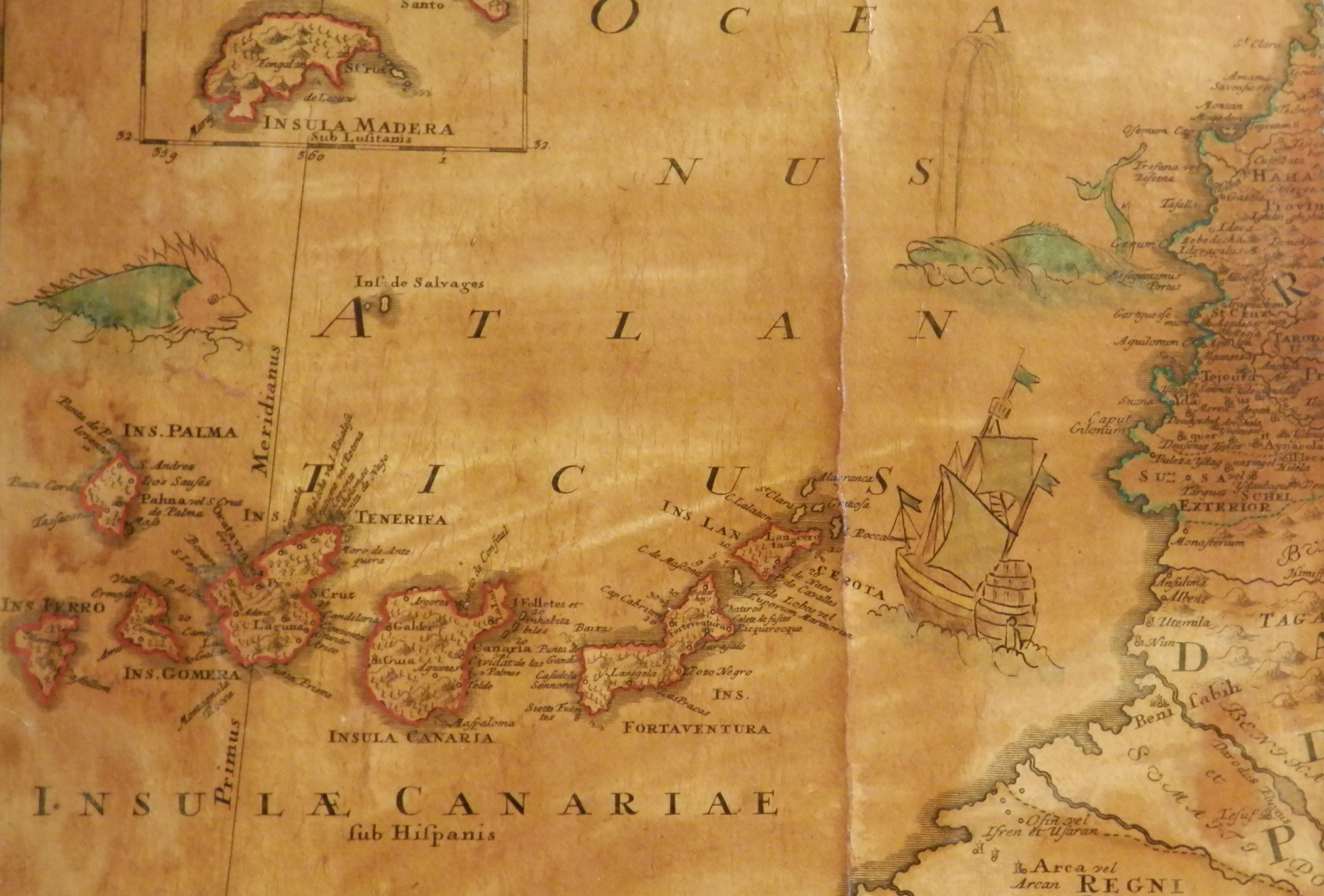 The three other items which are to be found on my map and not on any other that I have seen are two leviathans – one with a great spiked dorsal fin extending down it’s spine and the other spouting water and slapping it’s mighty tail. There is also a ship sailing up the east side of Lanzarote.