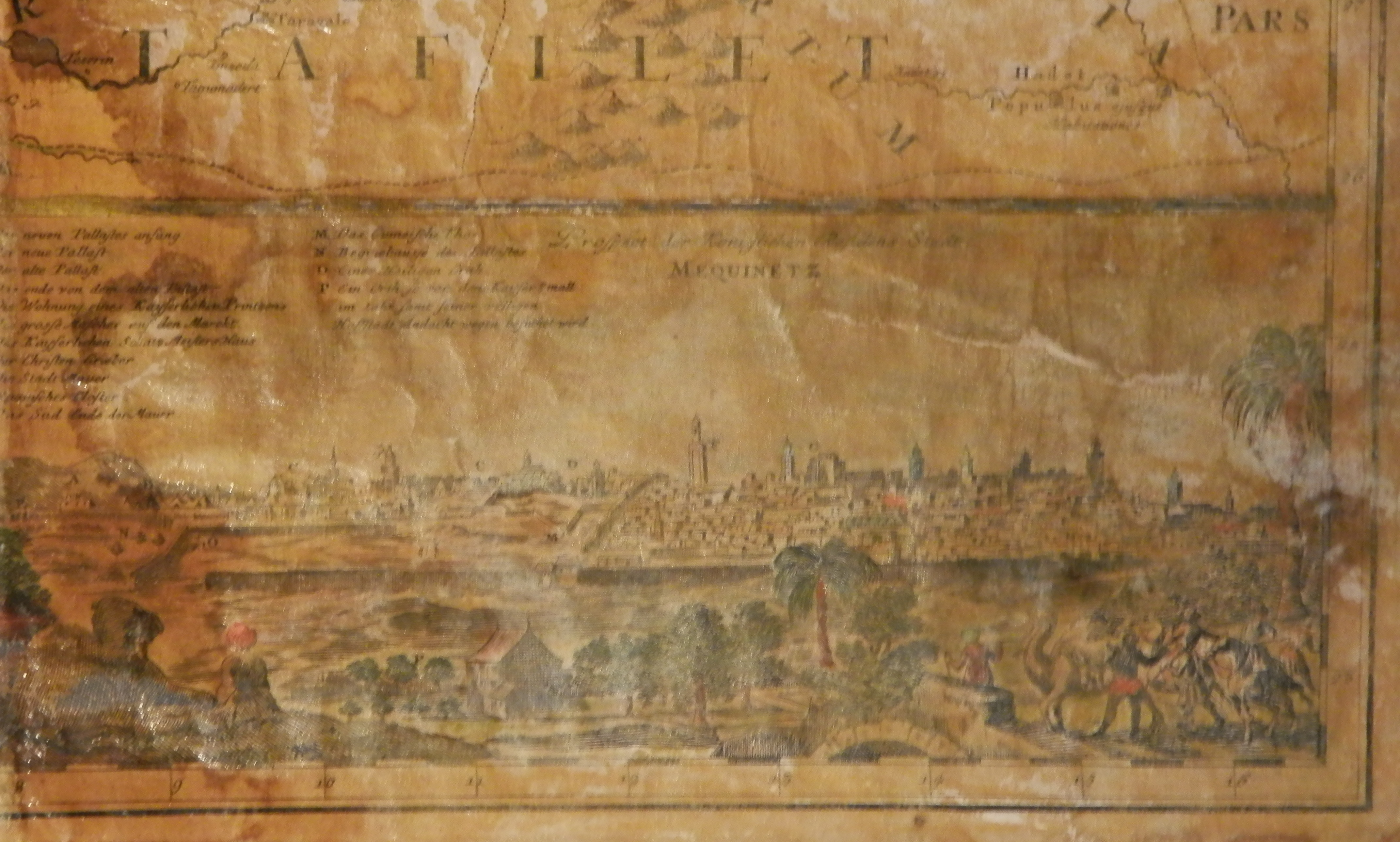 Along the bottom, below the map are two panoramic city views of “Morocco” (Marrakech) and “Mequinetz” (Meknes).