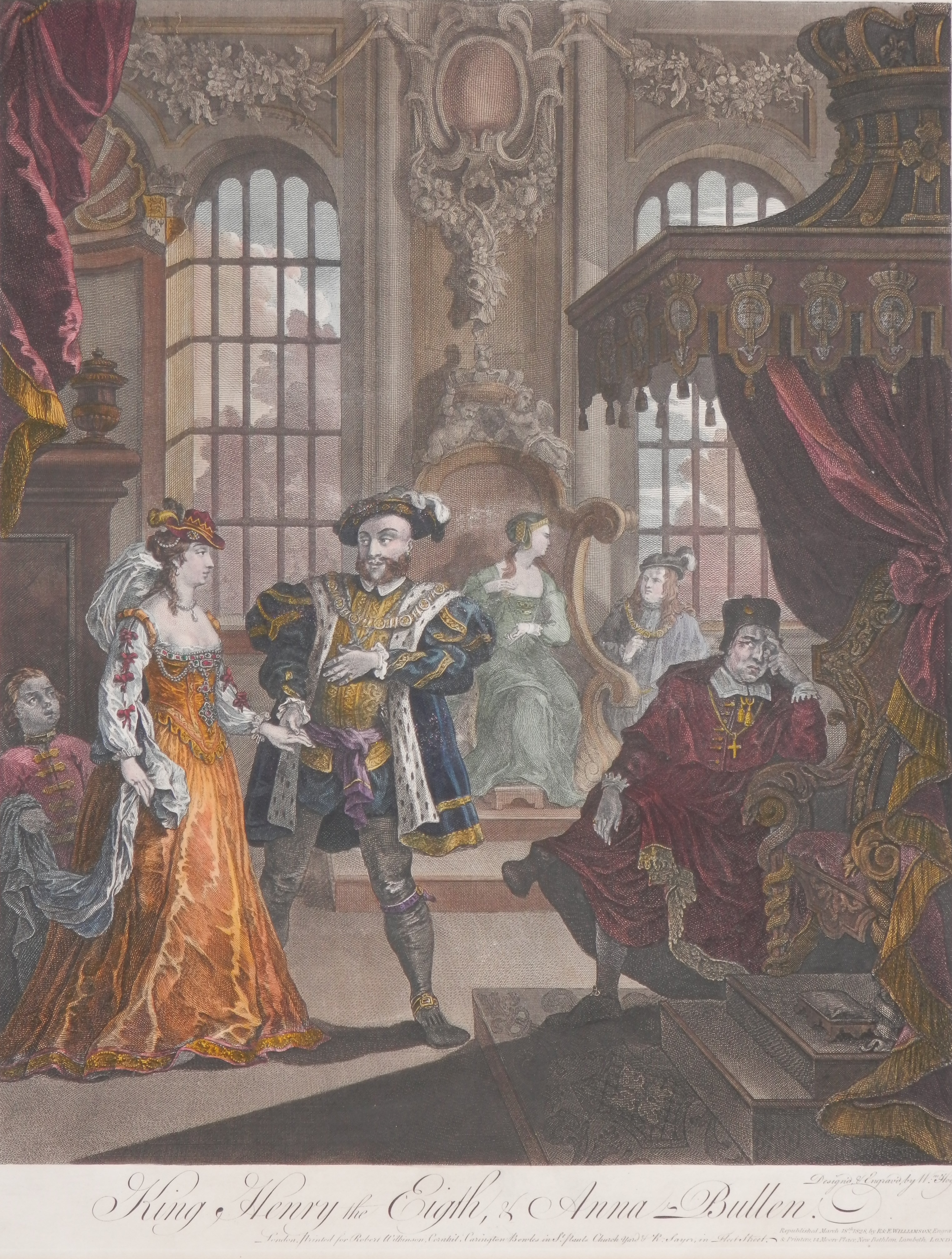 Hogarth is best known for his paintings on ‘modern moral subjects’. One set of paintings was titled ‘Marriage a la Mode’. He created paintings satirising many contemporary customs of which ‘The Rake’s Progress’ and ‘The Harlot’s Progress’ are the best known. He was a fine painter but as an artist, he knew that the sale of etchings created from the originals would lead to financial success. Hogarth was so successful that his works were often plagiarised which brought him into lobbying on behalf of the Copyright Act.In the etching to the left, we see #KingHenryVIII flirting with #AnnaBullen (Boleyn) while his wife, Catherine of Aragon, is seen behind him seated on the throne. On the right of the image we see Cardinal #ThomasWolsey. Anne Boleyn was Catherine of Aragon’s lady-in-waiting. Henry being desperate for a male heir wanted a divorce which Rome would not allow and this lead, eventually, to the English reformation.