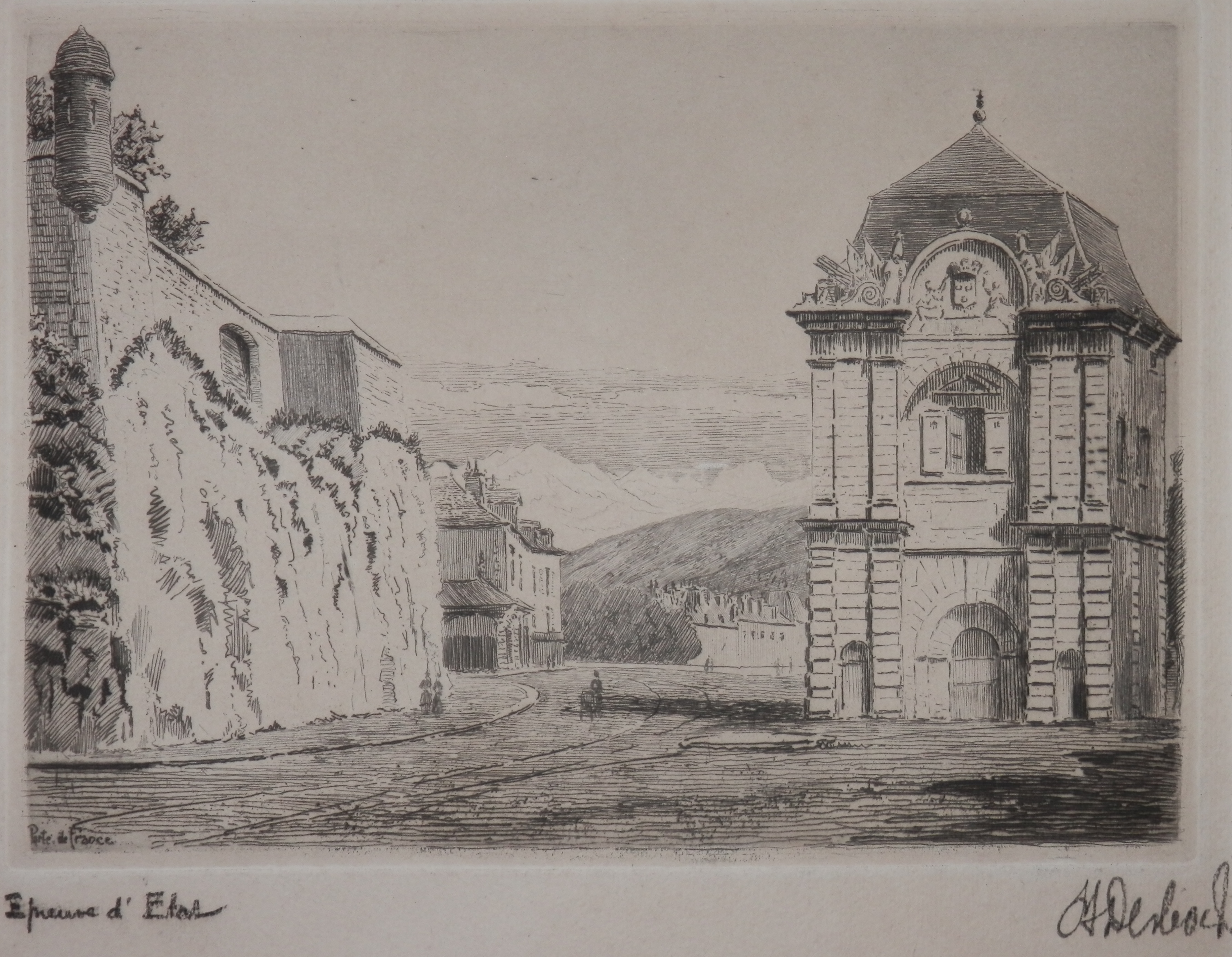 Grenoble is a base for winter sports but is also known for its’ wonderful museums , universities and research centres. It boasts a superb public transport system which includes the spherical cable cars known as “Les Bulles” (Bubbles) which connect the city to summit of ‘La Bastille’ hill named for the fortress on its’ slopes. The etching to the left is of the #PortedeFrance gate or entrance to the city. I suggest 1880 for a date of pressing as from 1894 the tram line which served the city until 1952 ran between the gatehouse on the right and the rock face on the left.