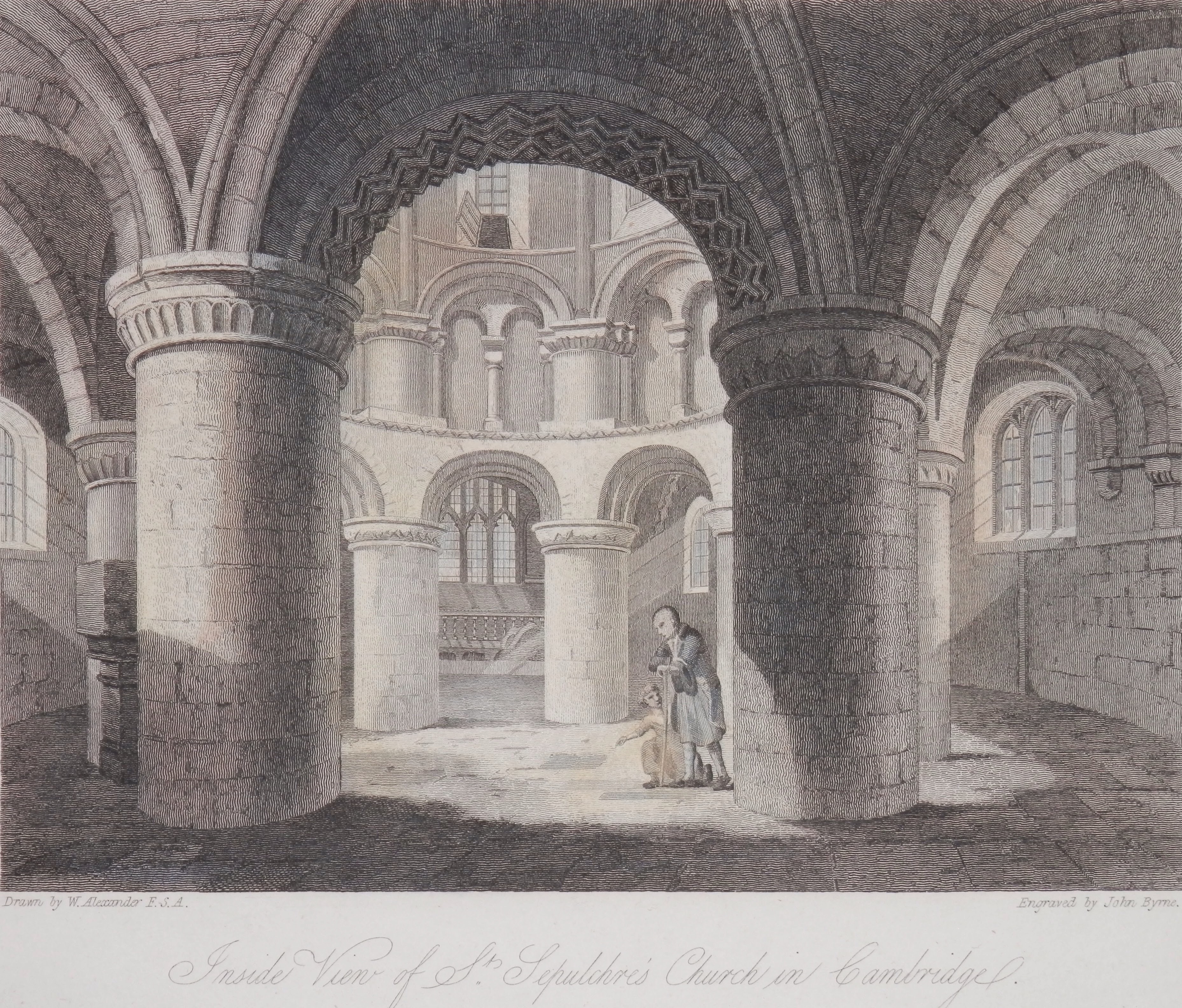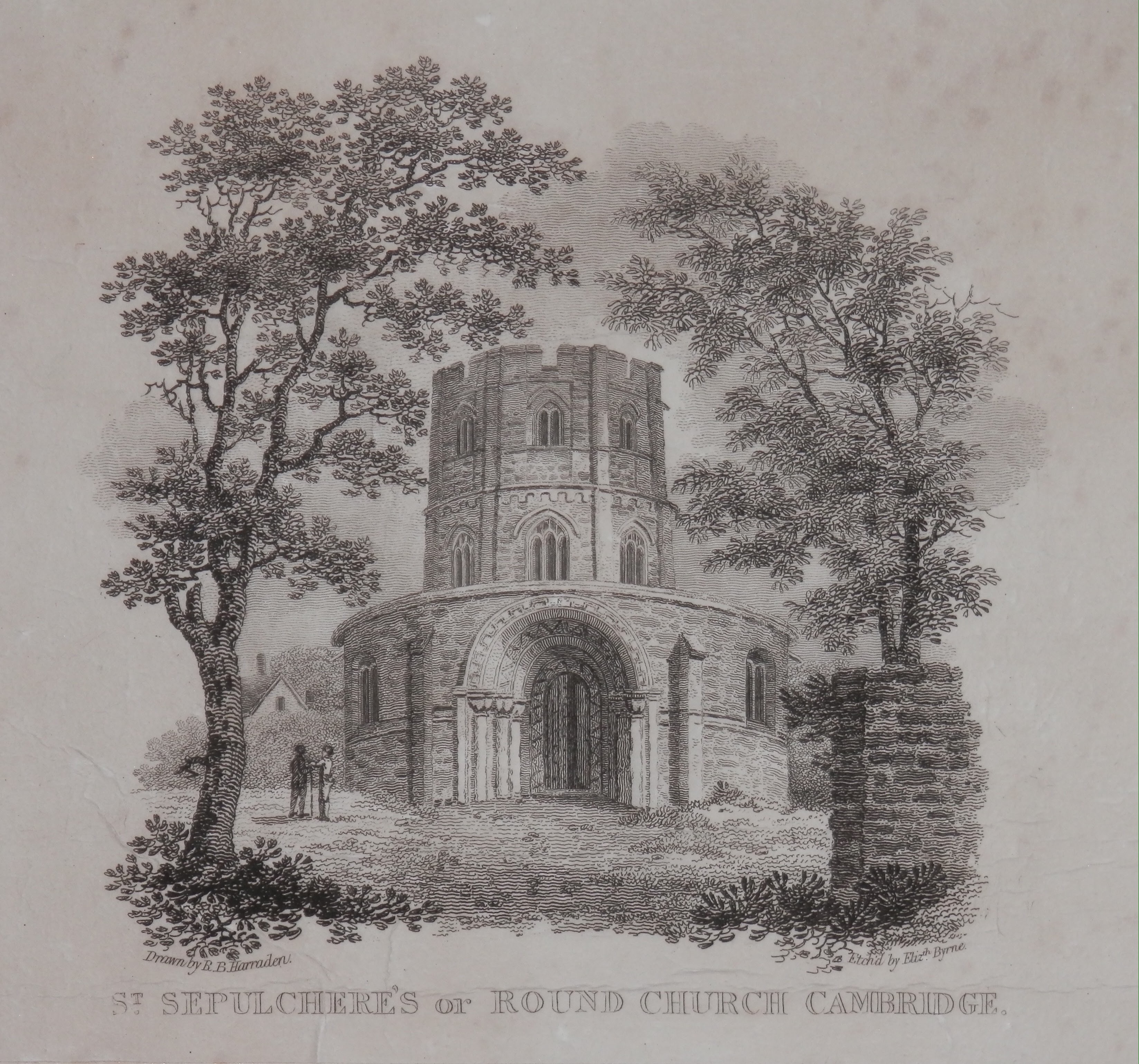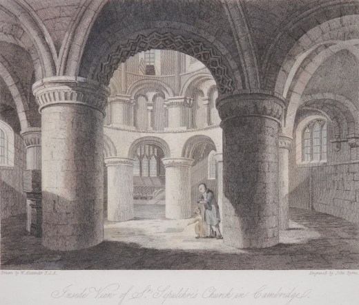 At the end of King’s Parade in Cambridge we find the Holy Sepulchre Church (known as the Round Church). It is one of four medieval round churches still in use in England. It consists of a round nave and an ambulatory, with a short chance, Originally a wayfarers’ chapel on the Roman road known as Via Devana (now Bridge Street). It became a parish church (13th century) and around this time structural alterations were made to the church, with the rebuilding of the chancel and the addition of a north aisle. During the 1400’s the Norman style windows in the nave were replaced by larger Gothic style window and the carvings of angels in the roofs of the chancel and aisle were added and a bell-tower was built over the nave. By the 19th century the church was in a poor state of repair. Since the major repairs have been carried out. The stained glass in the church was introduced during the 19th-century restoration while the depiction of Christ in Majesty was installed in 1946 as the east window was destroyed by a bomb in 1942.