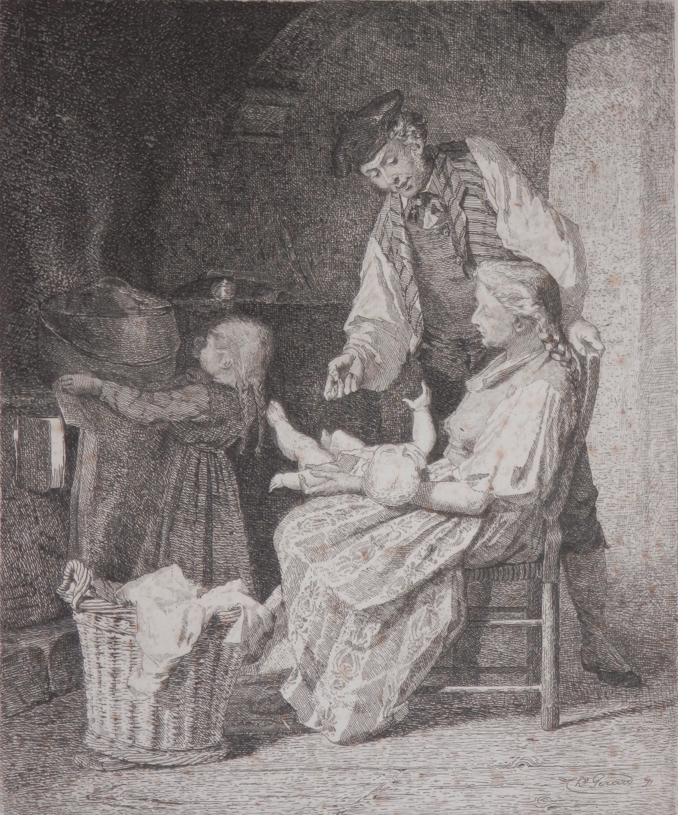 Theodore Gerard began studying art at an early age in his home town of Ghent. He set off in 1863 to find fame and fortune in the new nation’s capital the city of Brussels. To broaden his artistic and life experience, he traveled extensively throughout Germany and the Hungarian Empire. His reputation grew and his charming genre scenes won him awardsat exhibitions in Philadelphia, London, Vienna, and Brussels. Gerard’s reputation and talent won him a post of professor at the Brussels Academy of Fine Art-