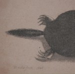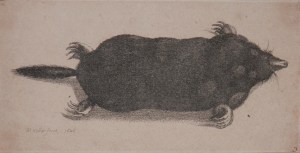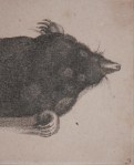 From a folio size etching to a much smaller one (2 3/4 x 5 1/2″ – cut on plate mark). Hollar was in Antwerp, in 1646, where he produced many of his most renowned works. Dutch cityscapes, seascapes, depictions of nature, still-life’s, and his ‘muffs’ and ‘shells’ series. My version (#3) of the run (full number unknown) has the two mishap scratch lines which occurred late in the etching process. A line coming from the top of the mole’s snout (toward top right)and a line coming out of the lower foot can be seen. It is signed by Hollar in the plate as well as the year of creation and there is a small number three in the bottom right corner.