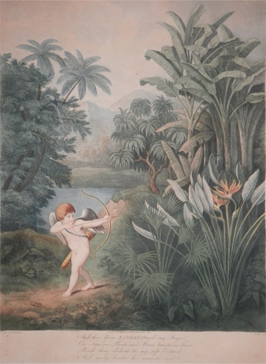 The plate, as I said, is the frontispiece for Temple of Flora and shows ‘Cupid Inspiring Plants with Love’. The plant he is shooting at is Strelitzia reginae or ‘Queen plant’. Thomas Burke engraved it after a painting by Philip Reinagle and Thornton published it in 1805. A superb print executed with exquisite skill and artistry.