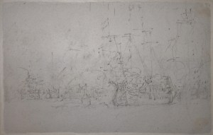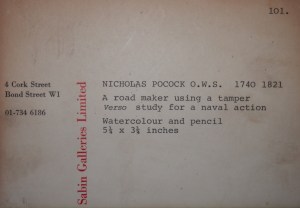The sketch on the verso is of a naval action. I have not yet tied it to a finished work but am still studying. Being known for his naval works, the verso side of this work is possibly the more interesting although it is less finished than than the face side. And finally the label on the back for the gallery through whose hands this work was sold.