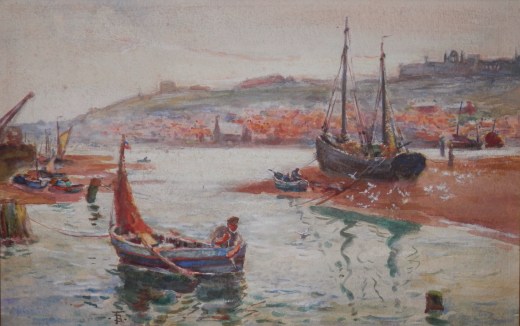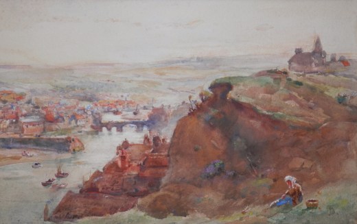 The two paintings, presented here, are, I believe, early in his watercolour phase. They are monogrammed (in the regular way) and titled on the verso ‘Whitby Harbour’ and ‘Whitby from West Cliff’. They show only the beginnings of the sentimentality found in his later works and certainly show his eye for detail and hand for execution. Both pieces are 6.25″ by 10.5″ and traveled through the hands of J Pratt Art Dealer in Nottingham. Two lovely pieces by a deservedly well thought of artist.