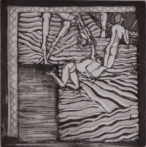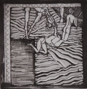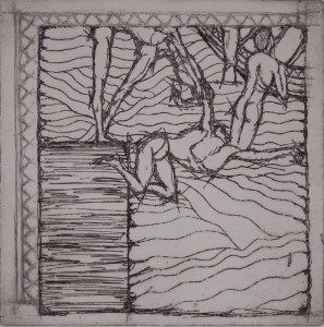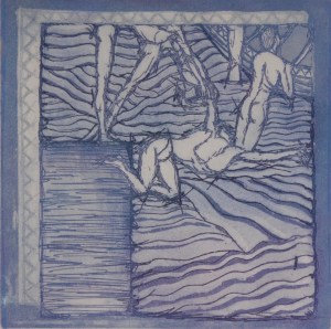 The painting from which this set of six etching states is taken from is entitled ‘Bathing’. It was painted in 1911 under the theme ‘London on Holiday’ for the dining room of Borough Polytechnic, London. It presently hangs in the Tate, London.