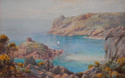 The scene which we see here is titled ‘Janvrin’s Tomb’. It is found on the tidal island of L’Ile au Guerdain in Portelet Bay. The tomb/tower is also known as Portelet Tower. It was built in 1808 by the British. It was 17ft (5m) tall and 27ft (8m) in diameter – housed a garrison of 12 men and their commanding sergeant and was armed with an 18-pounder carronade.