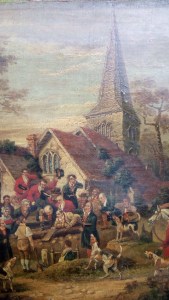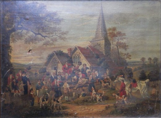 The scene depicts the moment when, Tom Moody’s body (d. 1796) was consigned to the grave. It was his wish that the gathered give vent to the ‘view-halloo’ and ‘tally-ho’ as he was laid to earth. Moody was long time whipper-in to Mr George Forester’s hunt in Shropshire. His odd request led to a ballad being composed about him which was performed at Drury Lane.