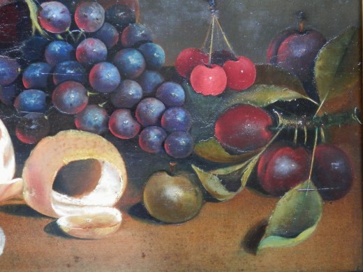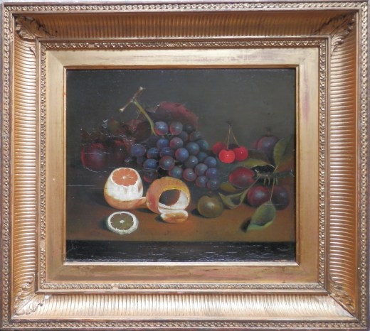 I will admit that the information I have found on Robert Kell calls him a journeyman painter and decorator and a house painter. He did paint artistic works but the two I have seen make him a mediocre artist. The citation here (which took a while to decipher) is painted over top of the original paint and has partially disappeared. As well I have never seen any artist sign his work ‘Painted by’. If my reading is correct, the inscription reads ‘Painted By Robert Kell 1859. The date would mean this painting was created in 1859 – some 21 years before his earliest known exhibiting. The frame – although fine – is not the original in which this piece was mounted. The quality of this still life says to me that there was no reason Kell should not not have been very well known and a professional in his own right and not a house painter.
