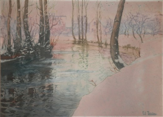 At first Thaulow focused on becoming an artist of seascapes and marine vistas but over time became more interested in landscapes especially those with small bodies of water. His masterful portrayal of water and how it reacts and reflects is sublime. Thaulow traveled between Norway and France for several years and finally settled in Paris for the last 14 years of his life. Thaulow is credited with bringing Impressionism to Norway. Thurlow did not marry, thus after his death, officials sold his studio.The aquatint presented here is titled ‘The River, Snowy Day’ or ‘Wintry Landscape’. It is known that Thaulow painted this scene several times (1 oil and 5 pastel drawings) Each with slight variations in the buildings. Mr. Vidar Poulsson, an expert on this artist, has stated that this present work was probably made during his stay at Petit-Appeville, a small village near Dieppe by the river Scie. Probably painted around 1895.