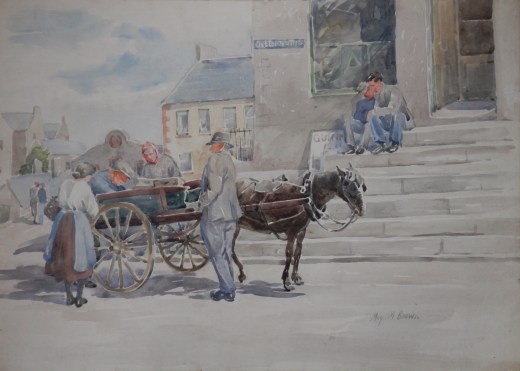 A street scene of a man selling his wares from the back of his horse drawn cart. I continue to look at this painting and there is some just so ‘real’ about it. She has captured something. The grouping feels right, body postures real, colouring good. All this without too much finesse and fine brush work. The evidence of a talented artist, who knew her stuff.