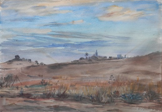 The watercolour, in my collection, is titled ‘Paissaje Tangerino‘ and shows a landscape near Tangier where Apperley lived from 1933 till his death in 1960. Whether it was a study for an oil painting or done ‘en plain air’ as a painting on it’s own, I do not know. It does show a nice use of colour and a deftness of brush stroke. I especially like the sky with it’s clouds. It is signed and date lower right on the face and again on the verso.