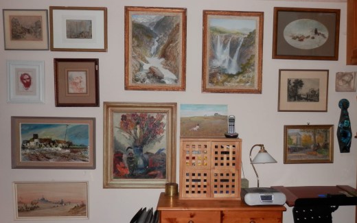 I try not to over power or indiscriminately hang pictures (although there may be no connection between them other than my liking them) so again I have limited myself to one one wall in another room which looks as follows.